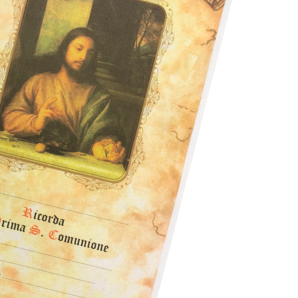 Attestato Prima Comunione realizzato su carta pergamenata, formato 17x24 cm circa.