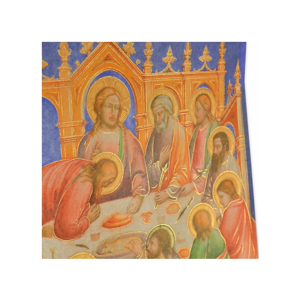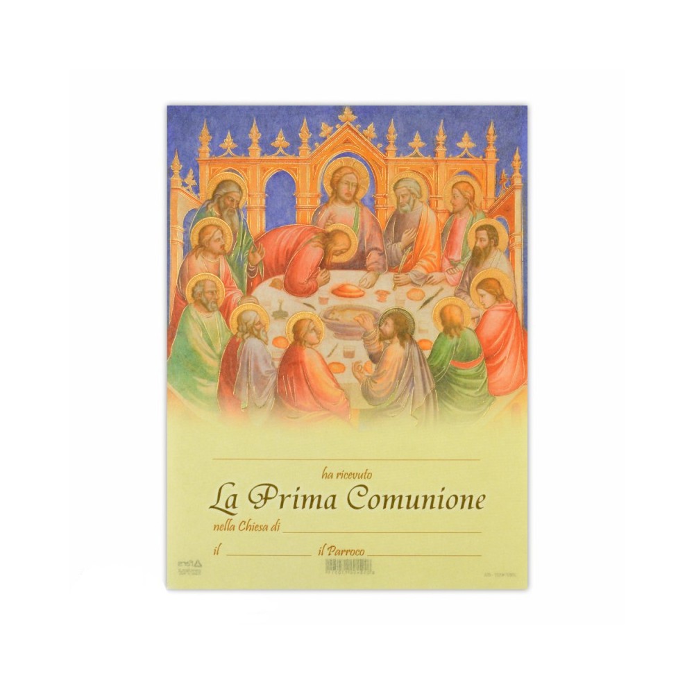 Elegante pergamena ricordo della Prima Comunione, arricchita con immagine dell’Ultima Cena. Formato 18x24 cm.