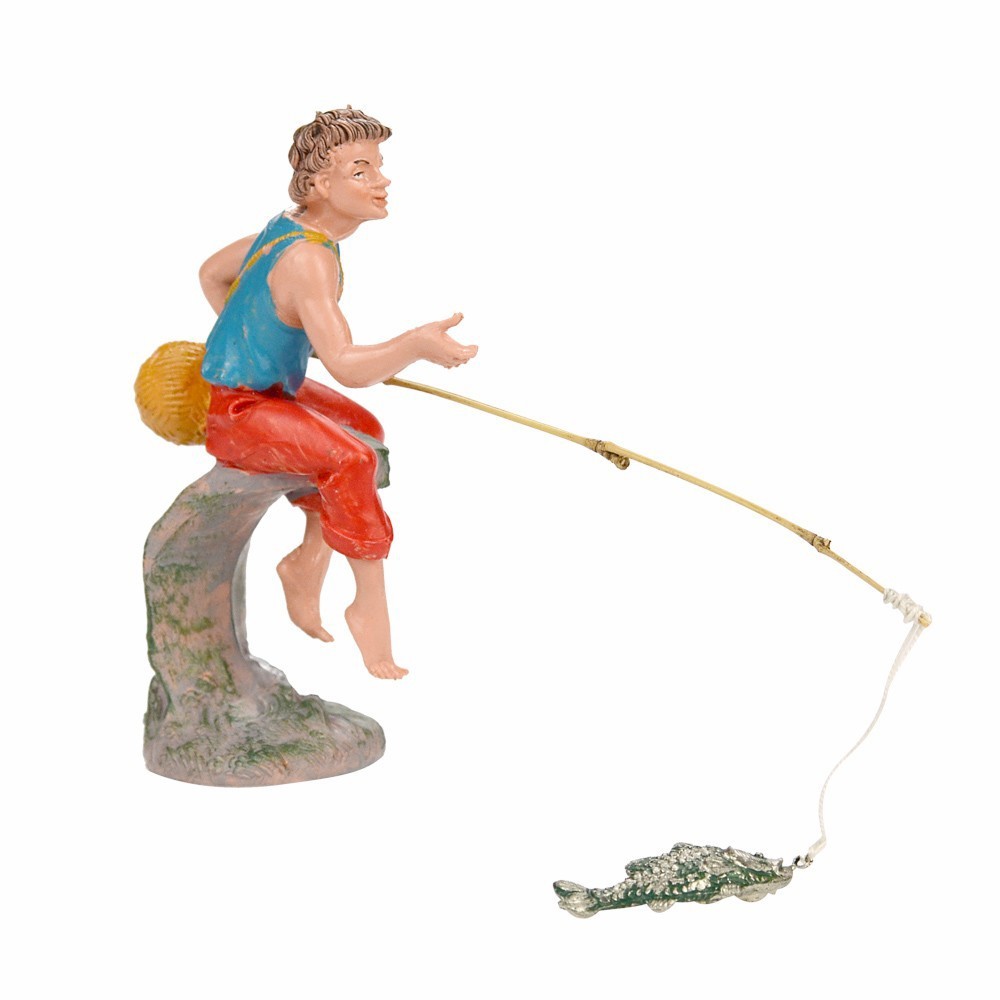 Statua FONTANINI: Pescatore con canna da pesca. La statua è adatta per presepe COLORATO da 10 cm. Realizzata con materiale infrangile dall'azienda Fontanini. Dipinta a mano. Prodotto 100% italiano.