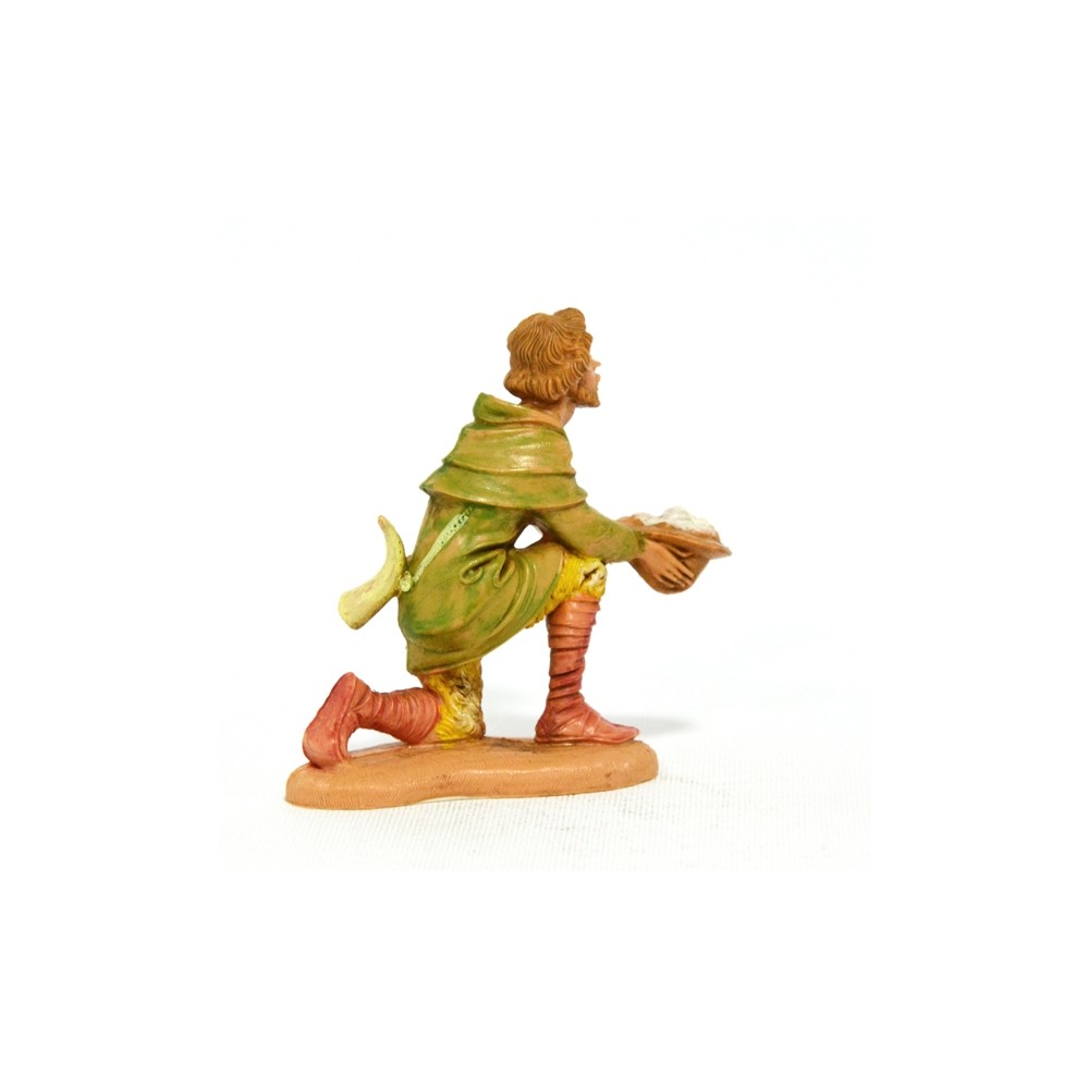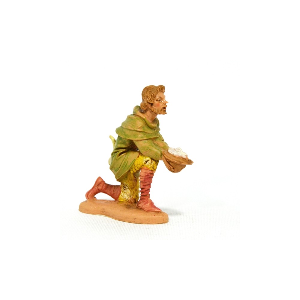 Pastore in ginocchio che offre il cappello pieno di lana per il Presepe Fontanini da 10 cm.