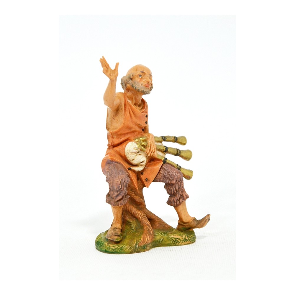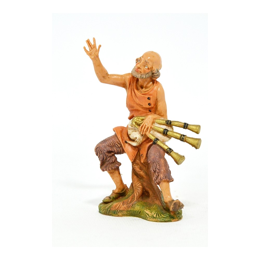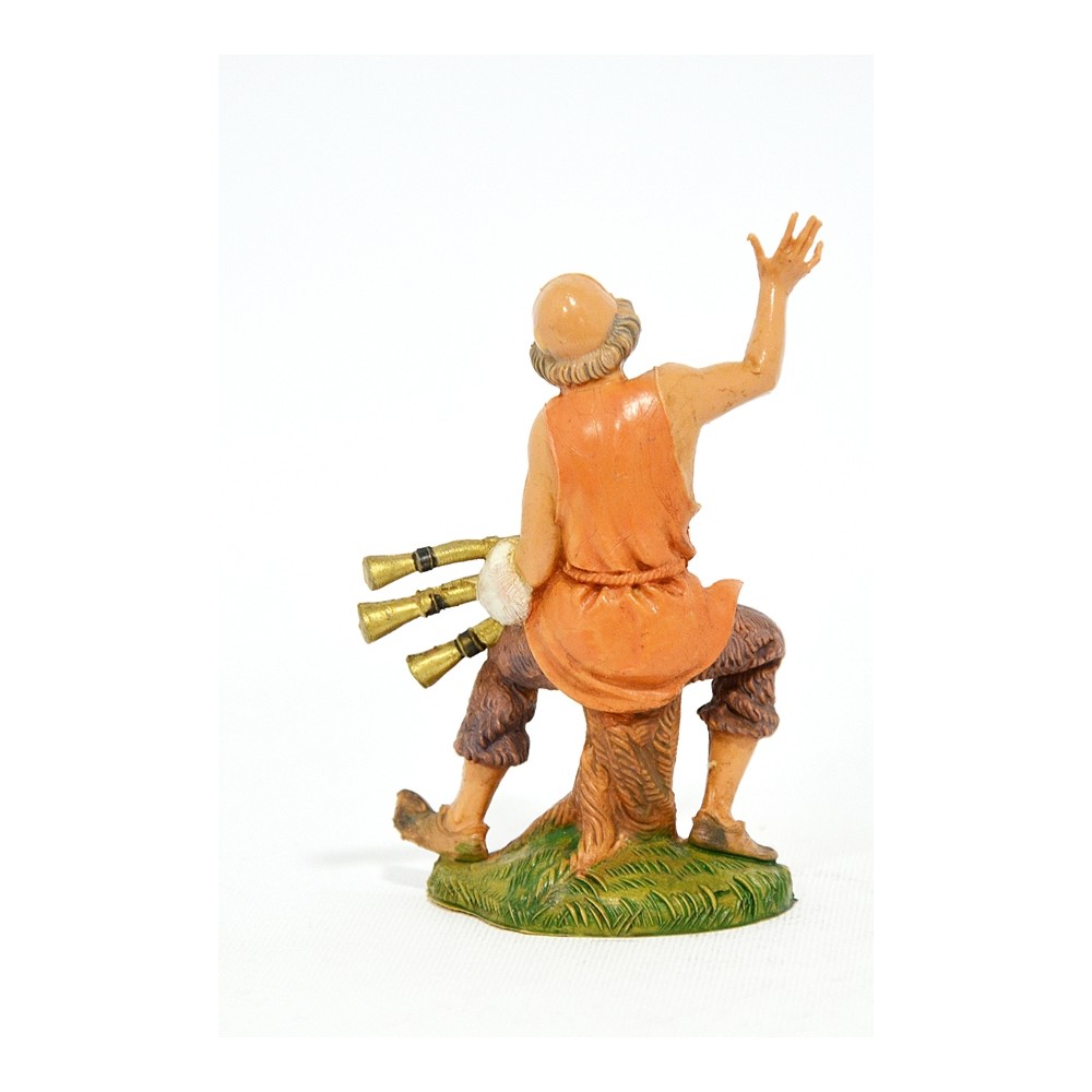 Pastore seduto su un ceppo d'albero con zampogna in mano per il Presepe Fontanini da 10 cm.