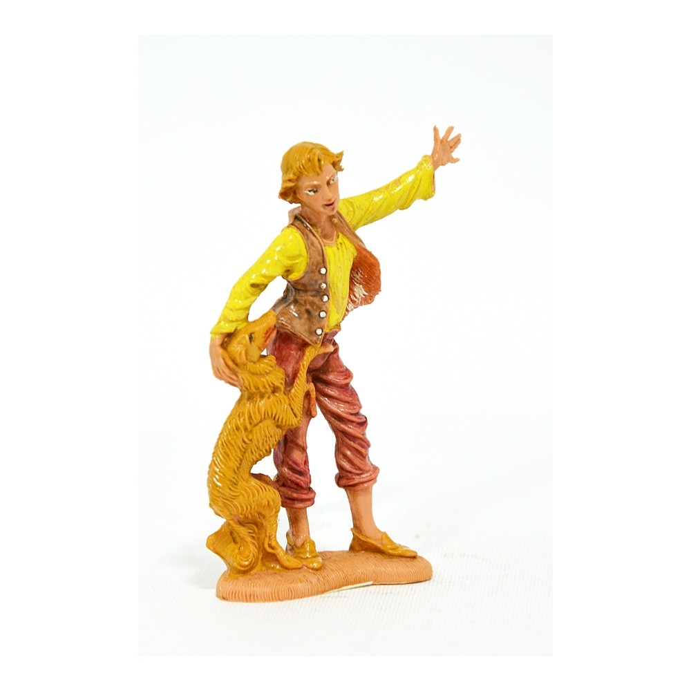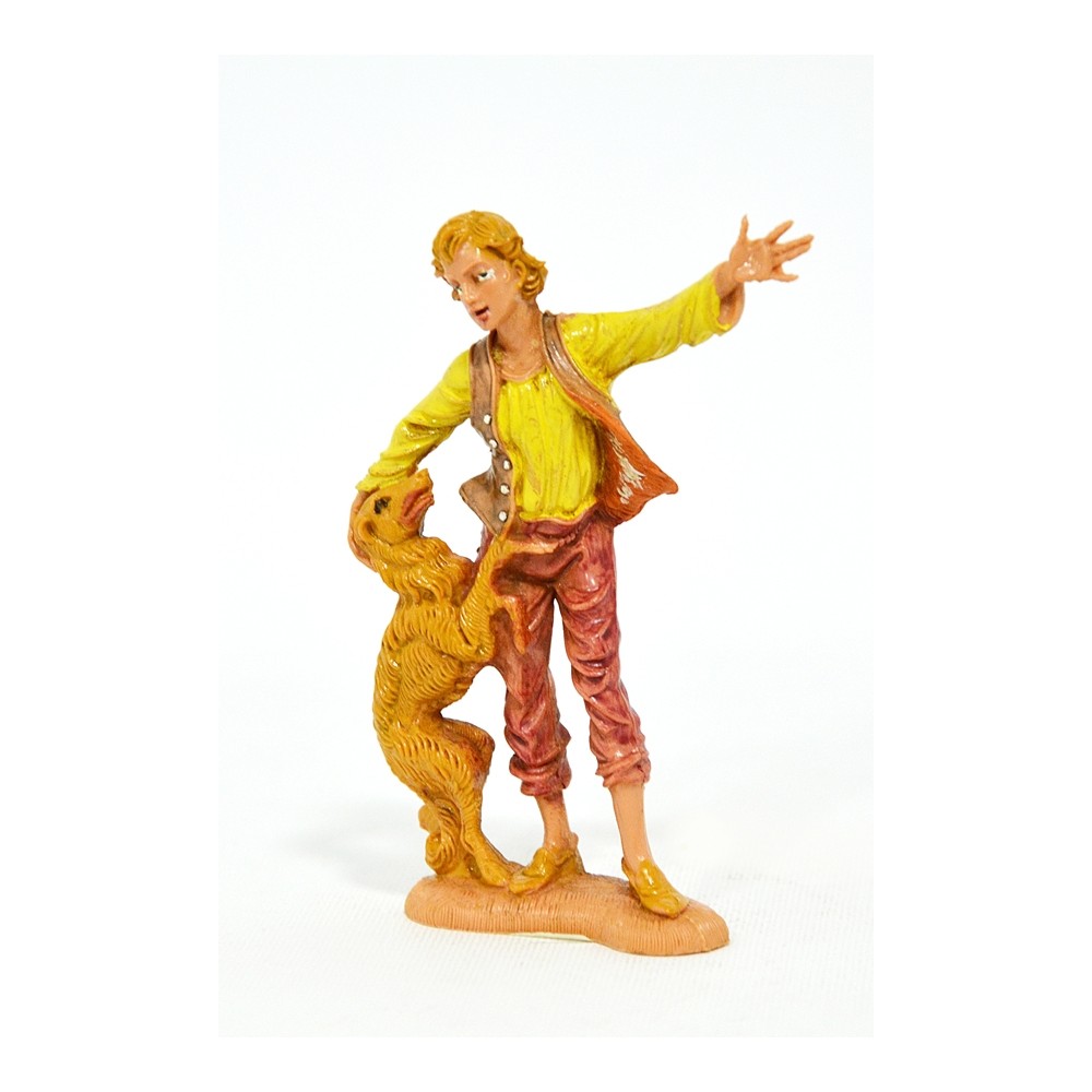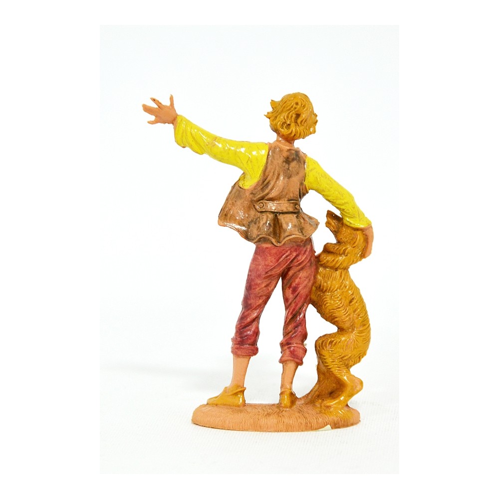 Statua del pastore Ragazzo che gioca con cane marrone per il Presepe Fontanini da 10 cm.