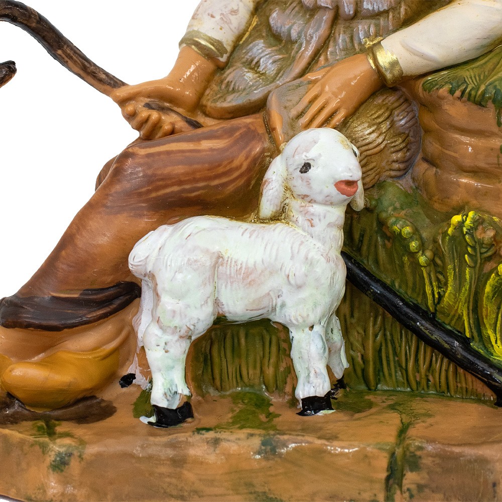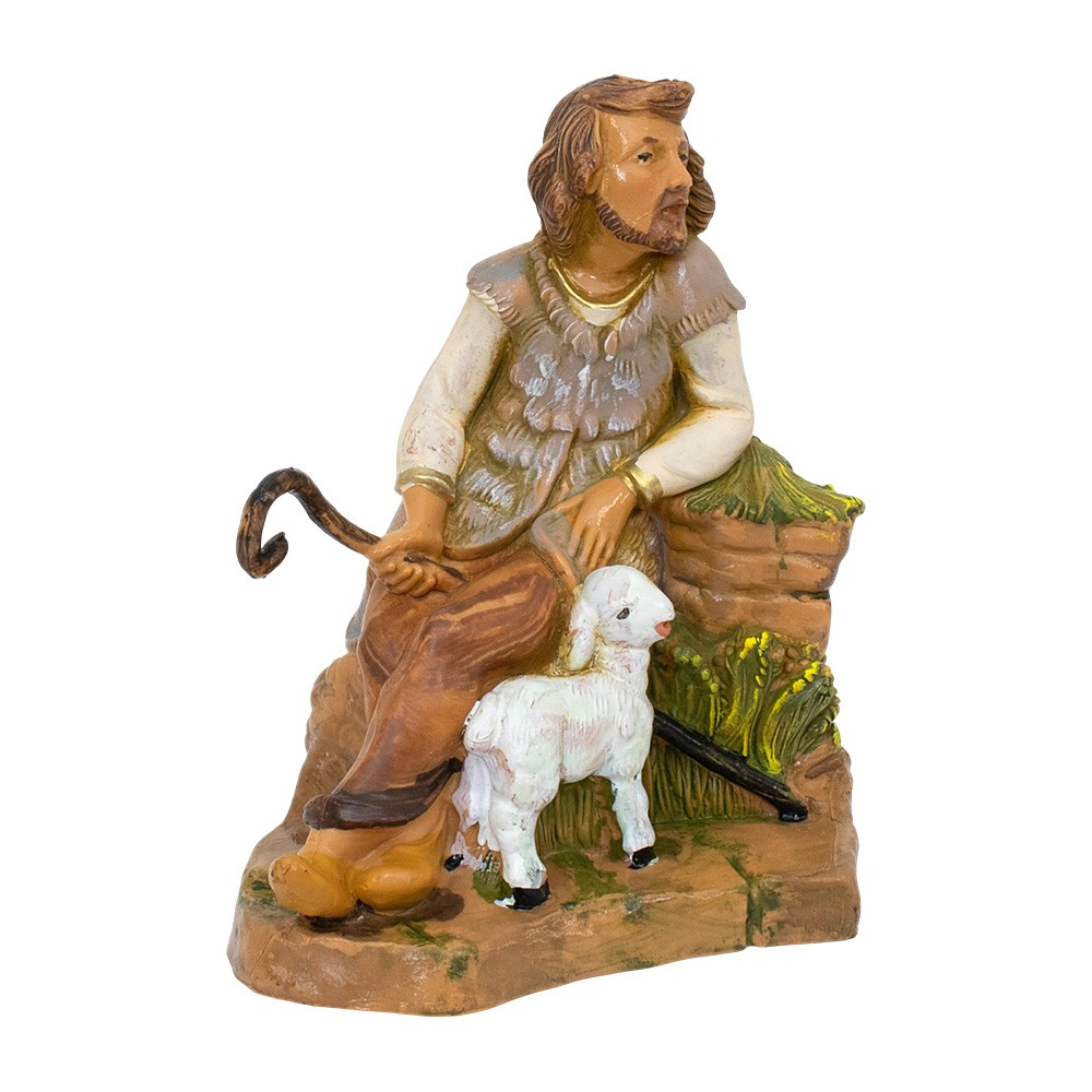 Statua pastore con pecora e bastone per presepe Fontanini 12 cm, realizzata in PVC dipinta a mano con cura artigianale.