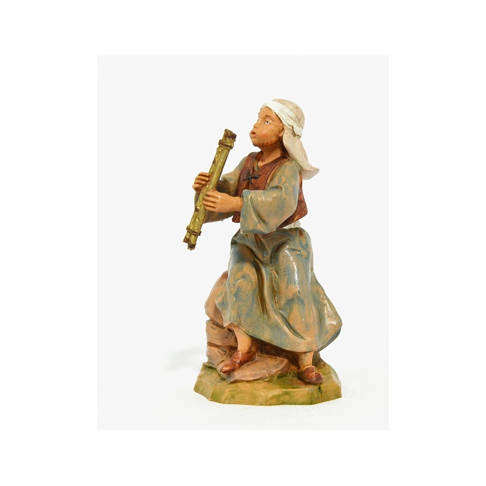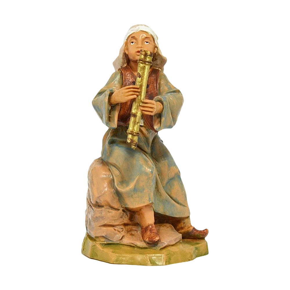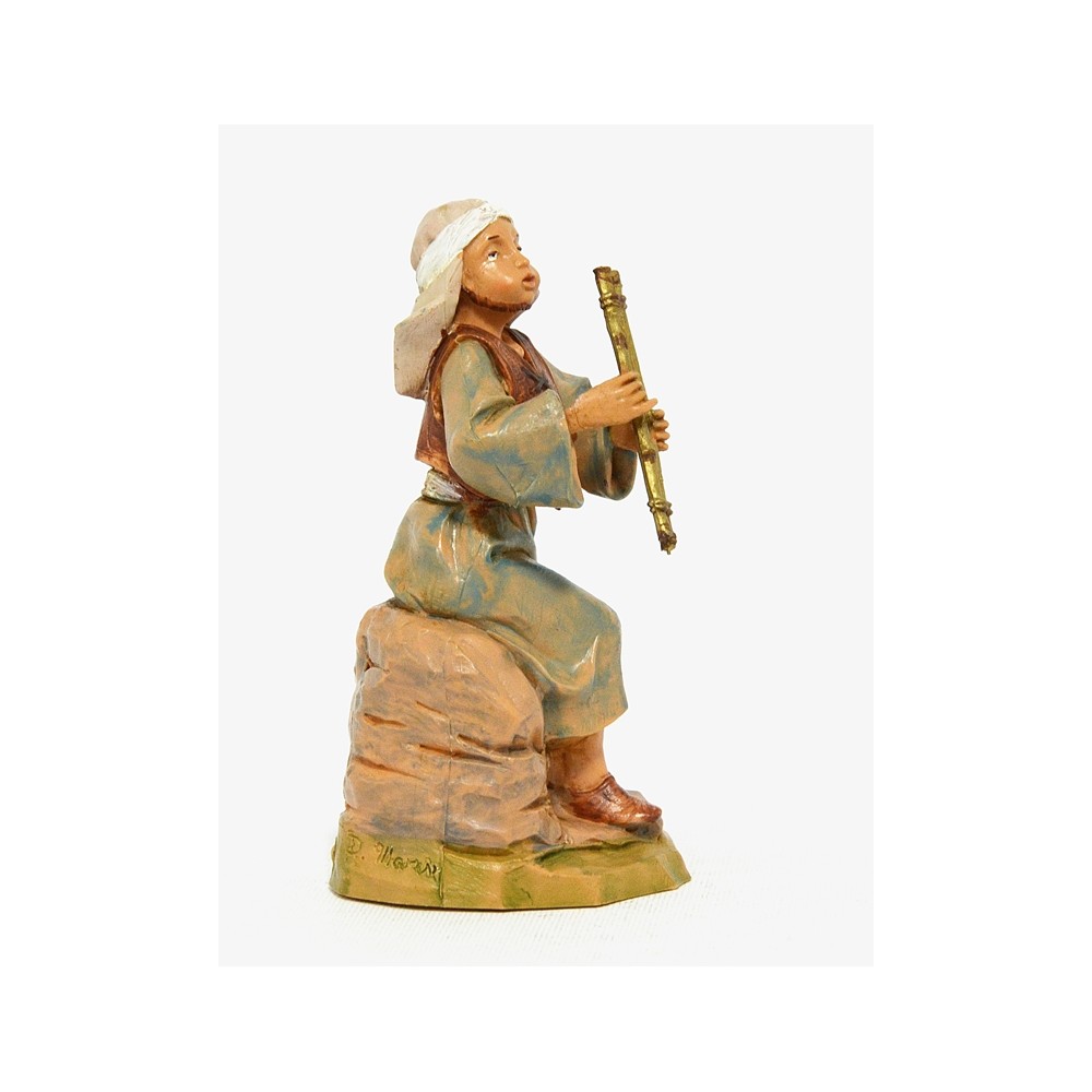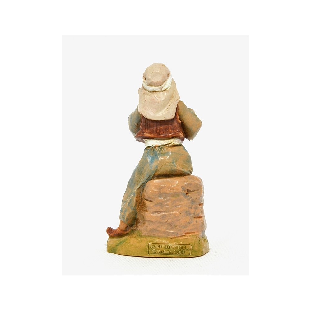 Statua del personaggio Pastore Pifferaio Seduto su una roccia per il Presepe Fontanini da 12 cm.