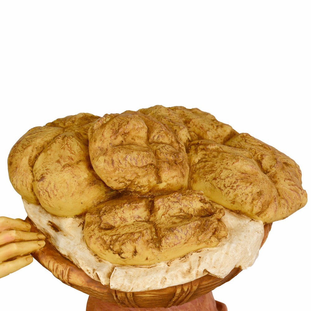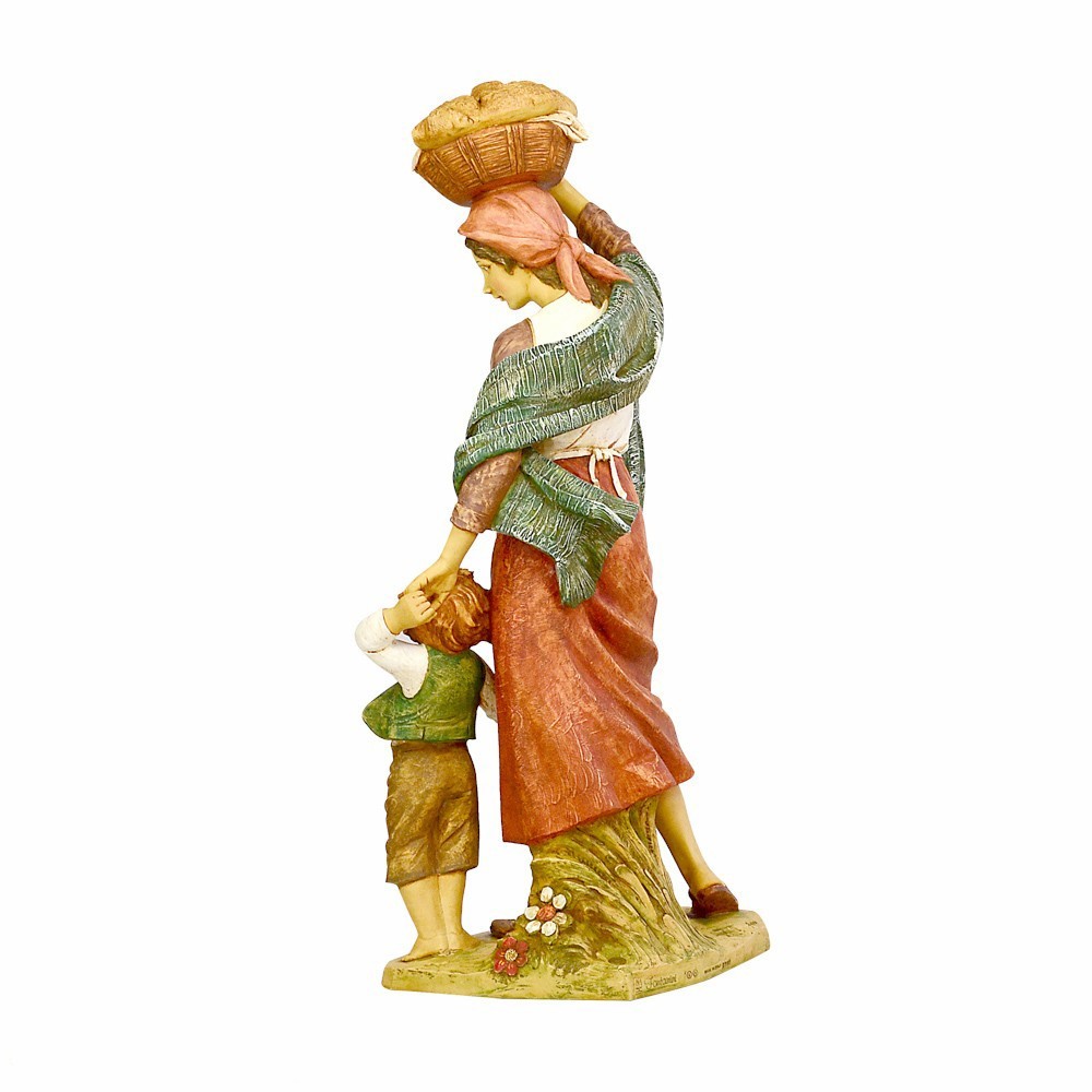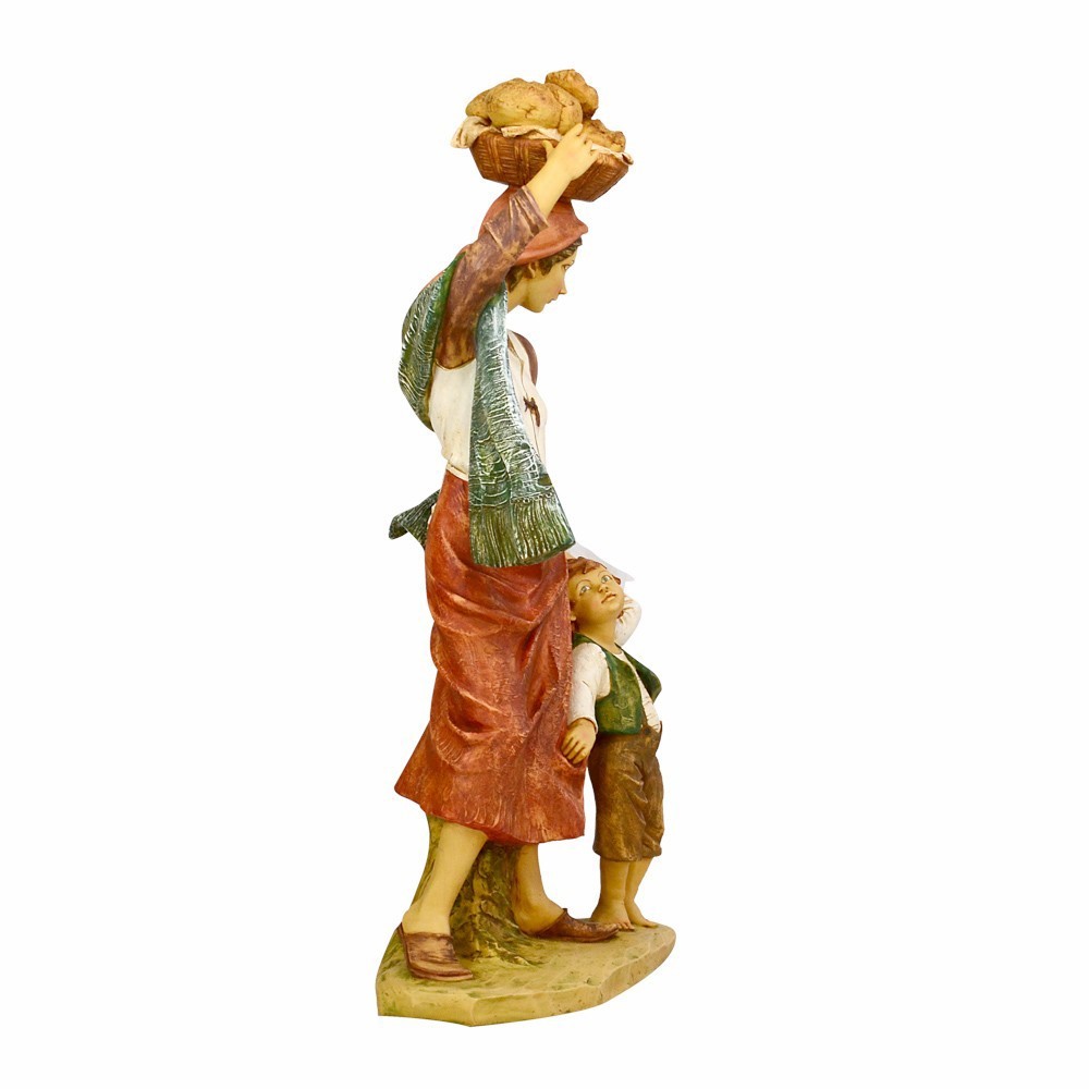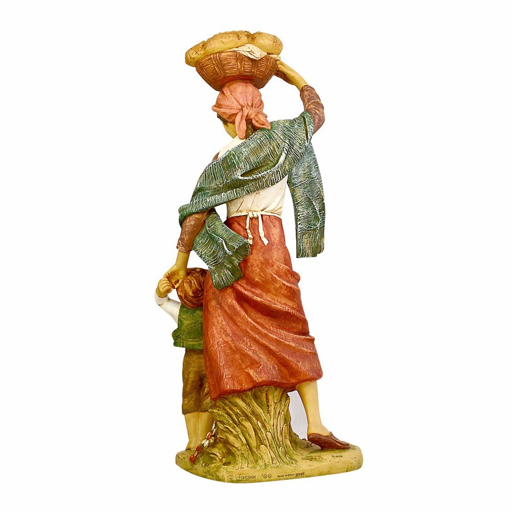 Statua pastorella con bimbo e cesto di pane in testa prodotta dall'azienda Fontanini. Realizzata in resina adatta per presepe da 125 cm. Questa azienda produce da anni presepi e statue religiose di alta qualità, curando tutti i dettagli. Dipinta finemente a mano. Made in Italy.