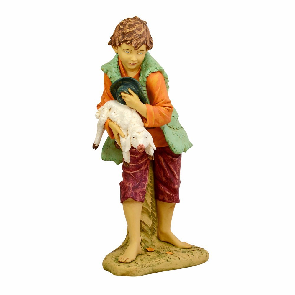 Bambino con agnello in mano proporzionato per statue Fontanini da 125 cm. Statua in resina e dipinta interamente a mano. Articolo di alta qualità realizzata dall'azienda Fontanini. Made in Italy.