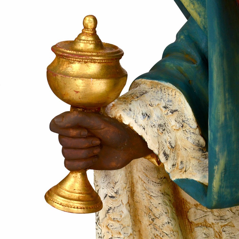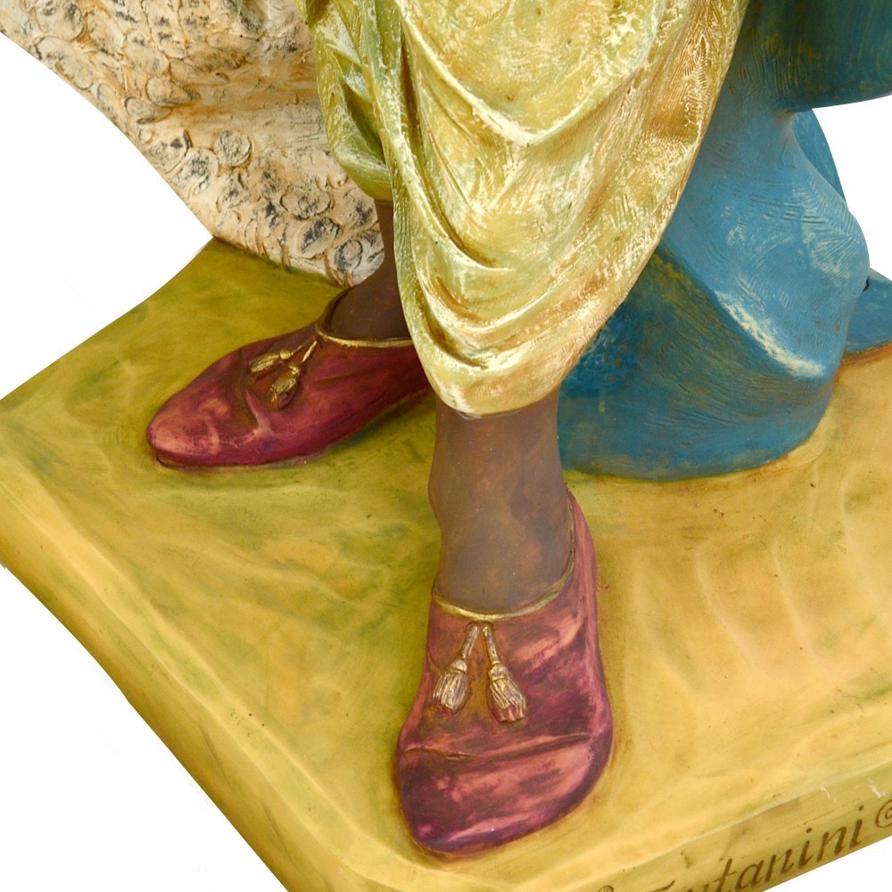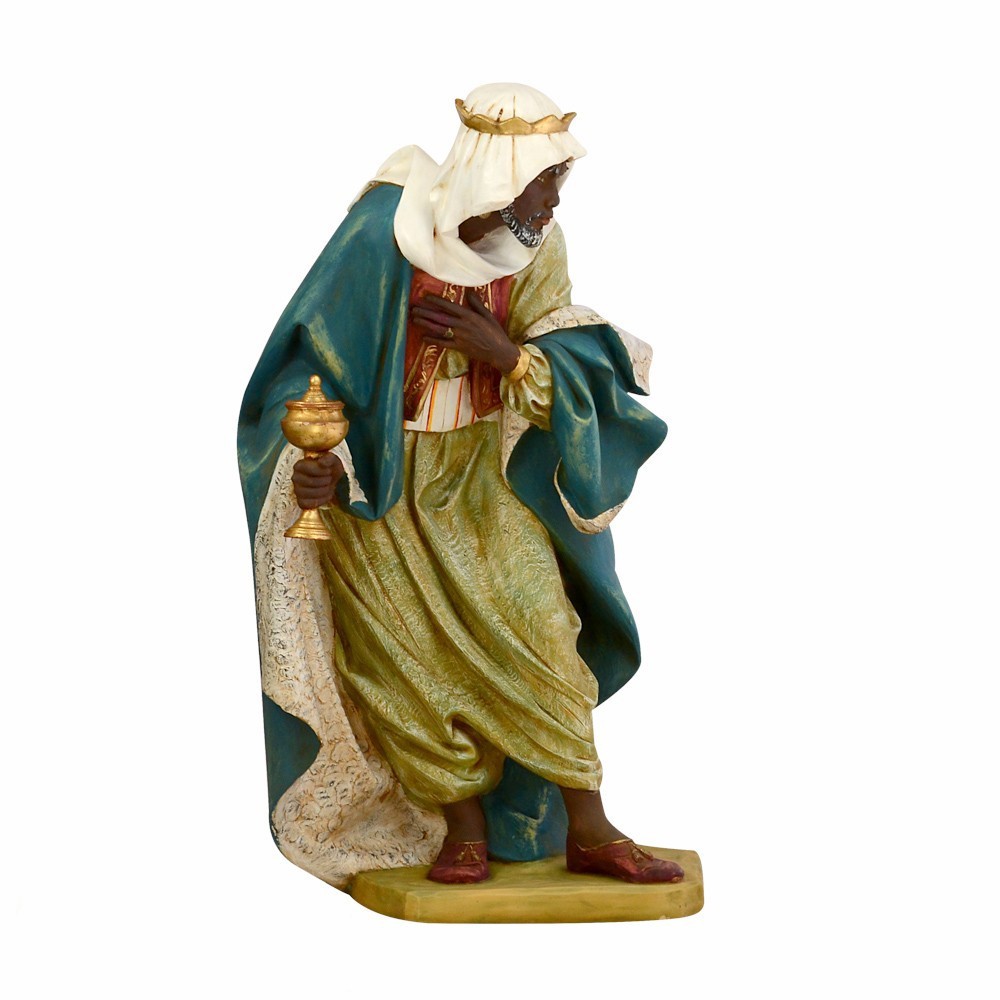 Statua RE MAGIO MORO in piedi con il mantello di colore blu. La statua è adatta per presepe fontanini da 125 cm.