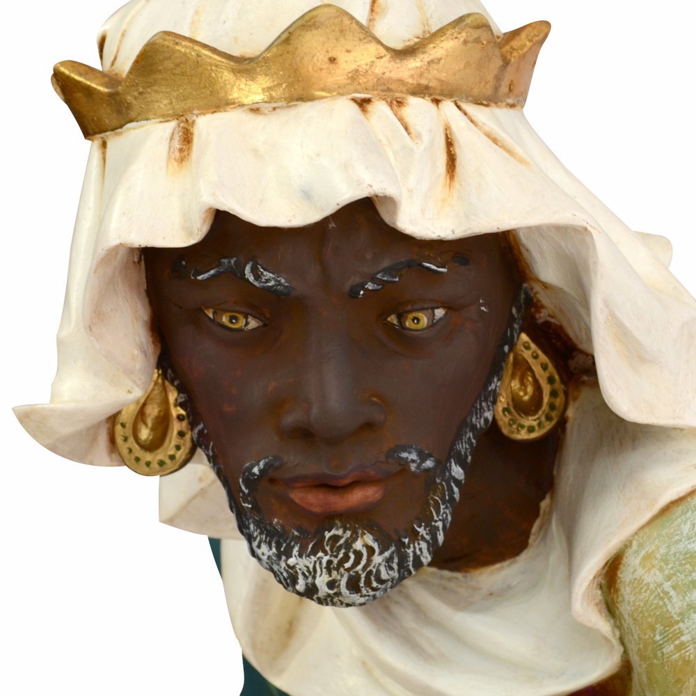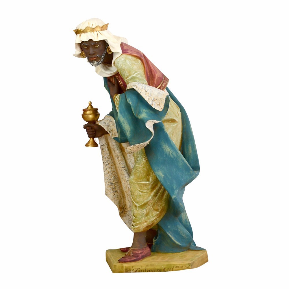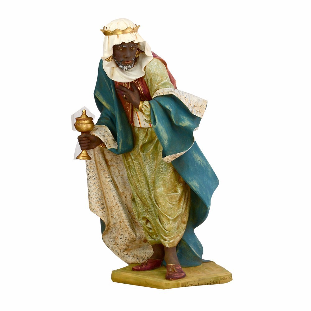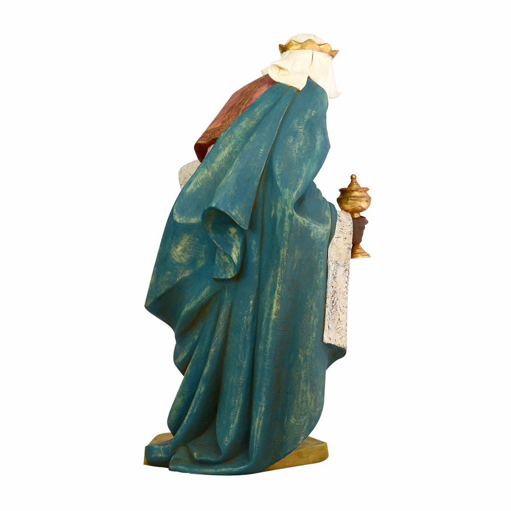 Statua RE MAGIO MORO in piedi con il mantello di colore blu. La statua è adatta per presepe fontanini da 125 cm.