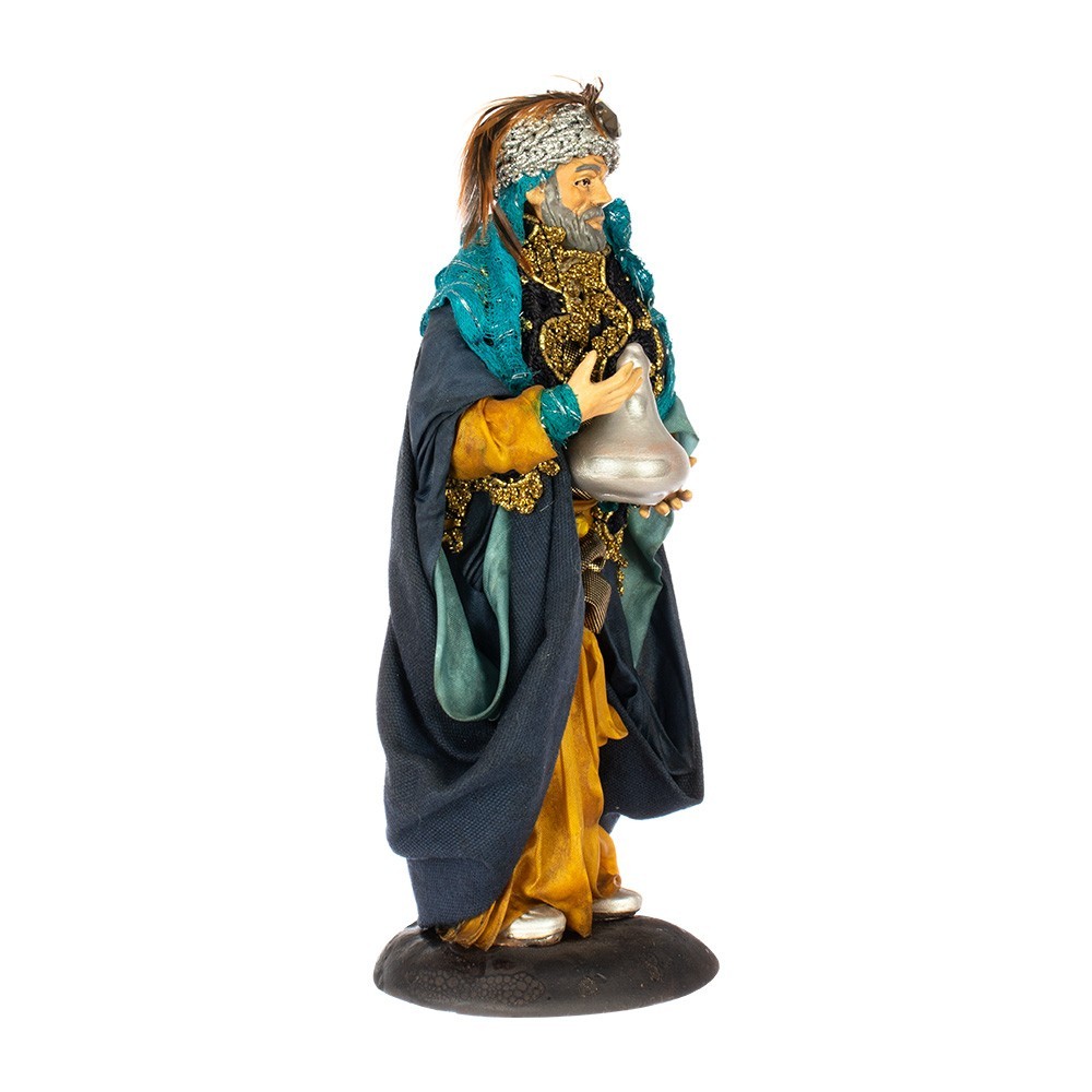 Re Magio Mulatto presepe napoletano. Realizzato in terracotta con abiti in tessuto da 20 cm. La statua è realizzata a mano rifinita con cura in ogni dettaglio. Made in Italy.
