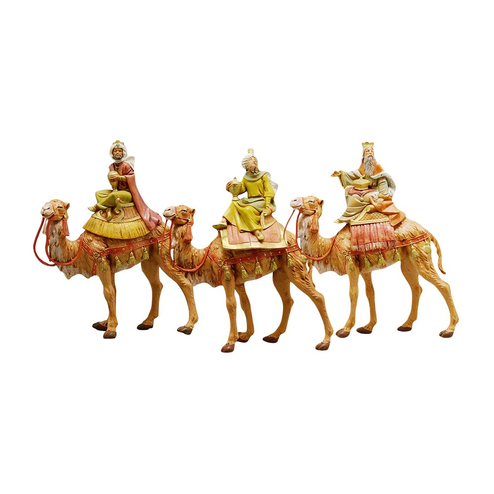 Personaggi: I Tre Re Magi a Cammello (Re Magio Bianco, Re Magio Mulatto, Re Magio Moro) a Piedi per il Presepe Fontanini da 19 cm.