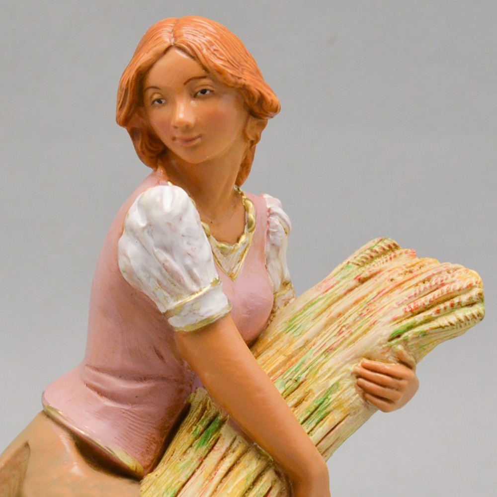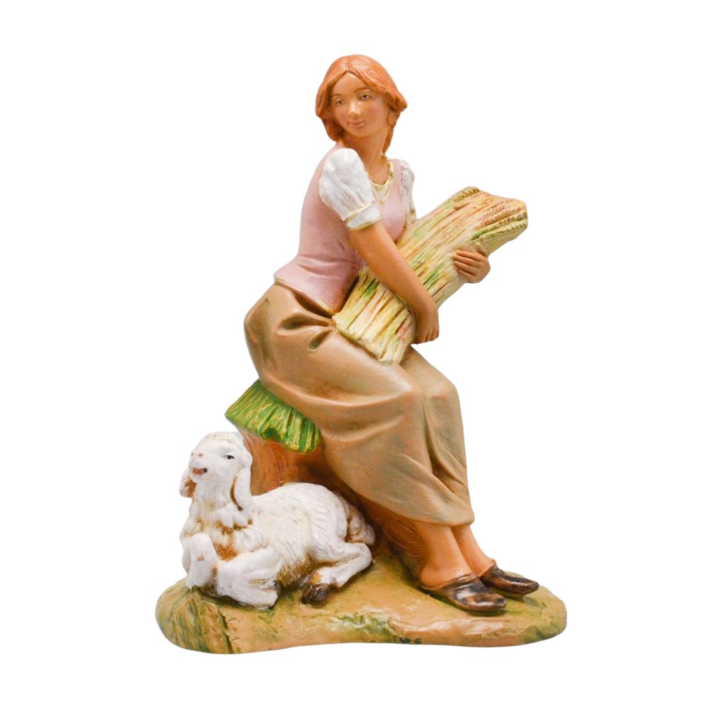 Statua Pastorella Seduta con pecora per presepe Fontanini da 19 cm. Dipinta interamente a mano e realizzata in PVC. Colorazione: Tipo legno. Prodotto italiano.