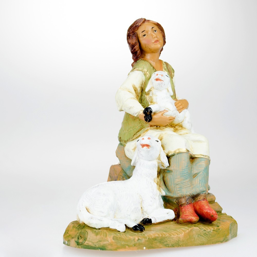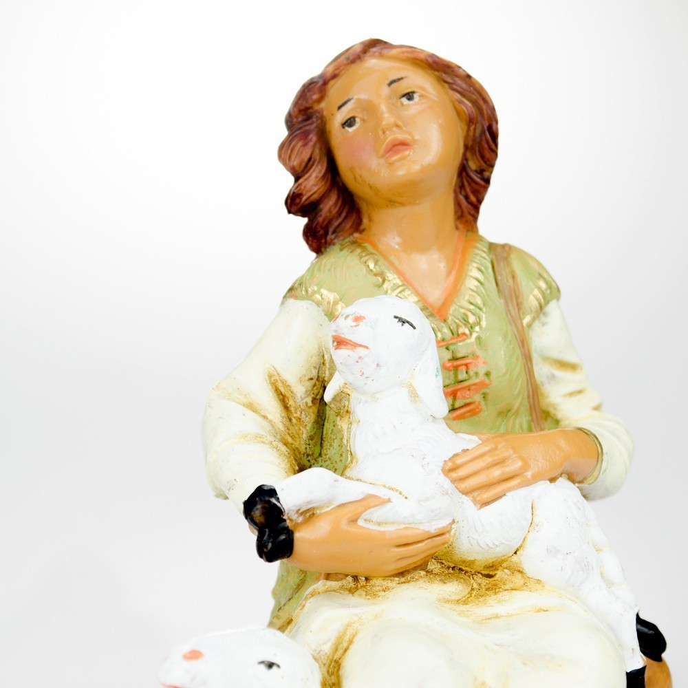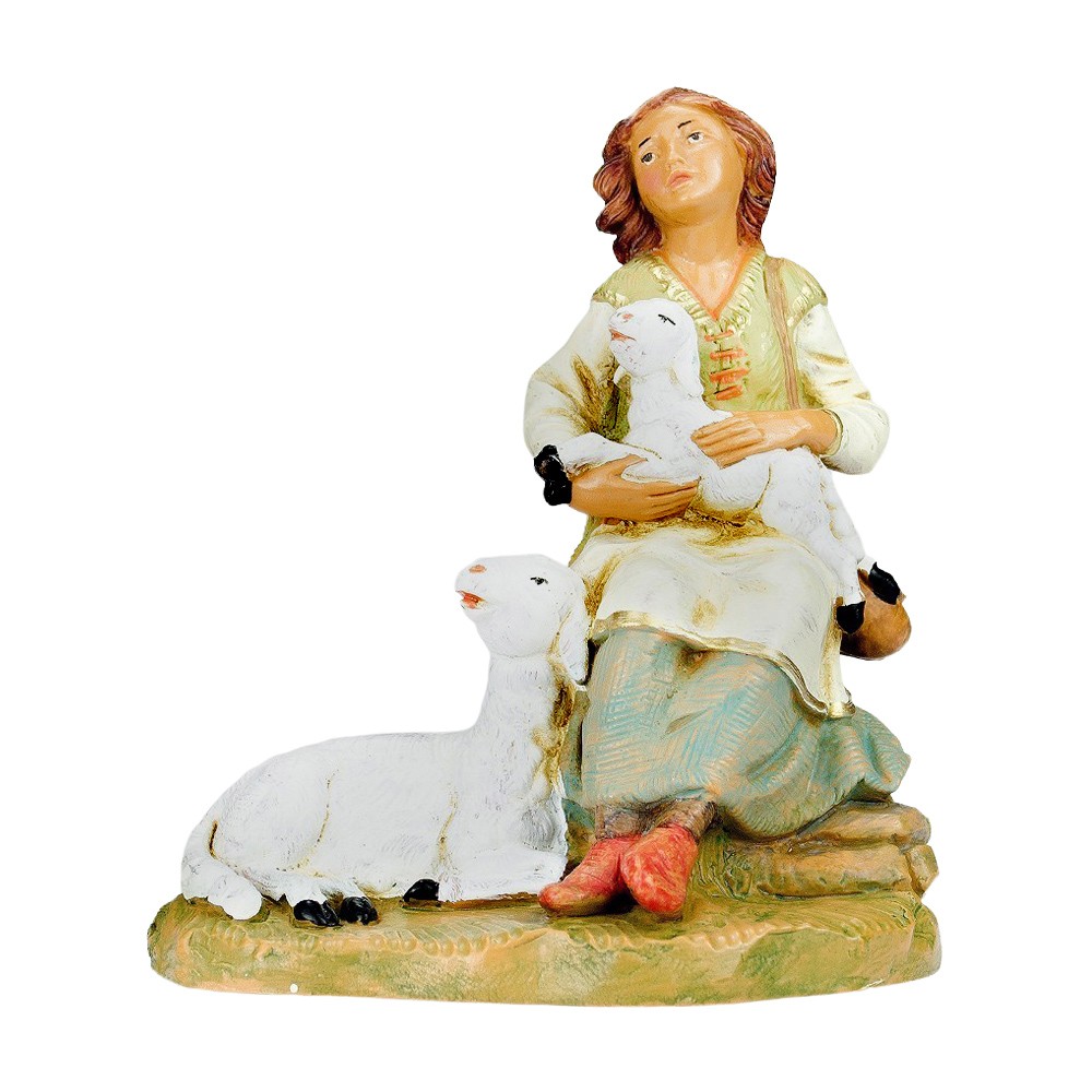 Personaggio presepe Fontanini: Pastorella seduta con una pecorella in braccio e una a fianco.