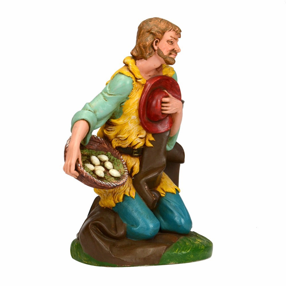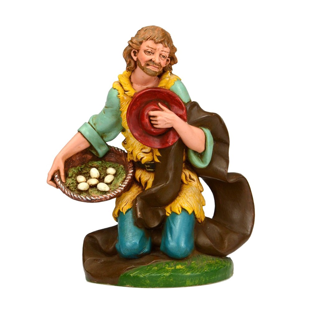 Pastore con Uova in PVC (materiale infrangibile) adatto per presepe da 30 cm. Realizzata dall'azienda Fontanini, da anni produce presepi e statue religiose di alta qualità, dai dettagli curatissimi. Dipinta finemente a mano. Made in Italy.