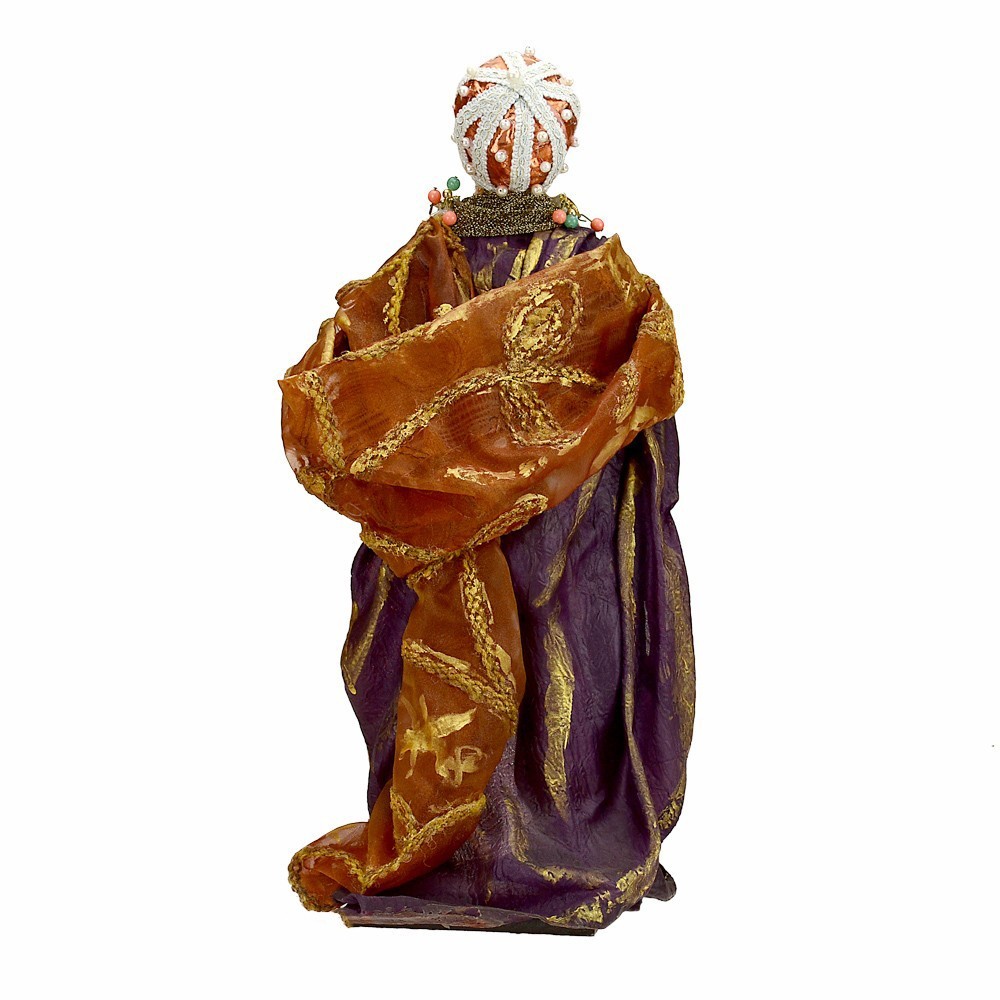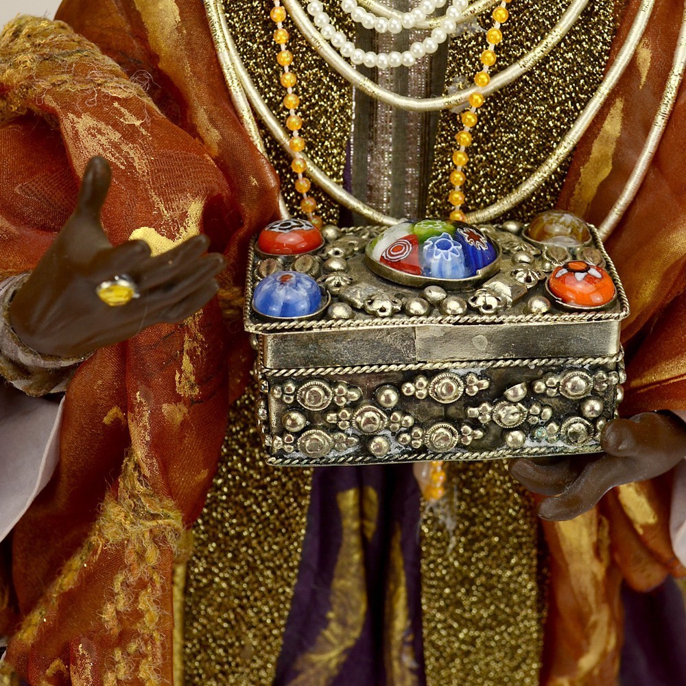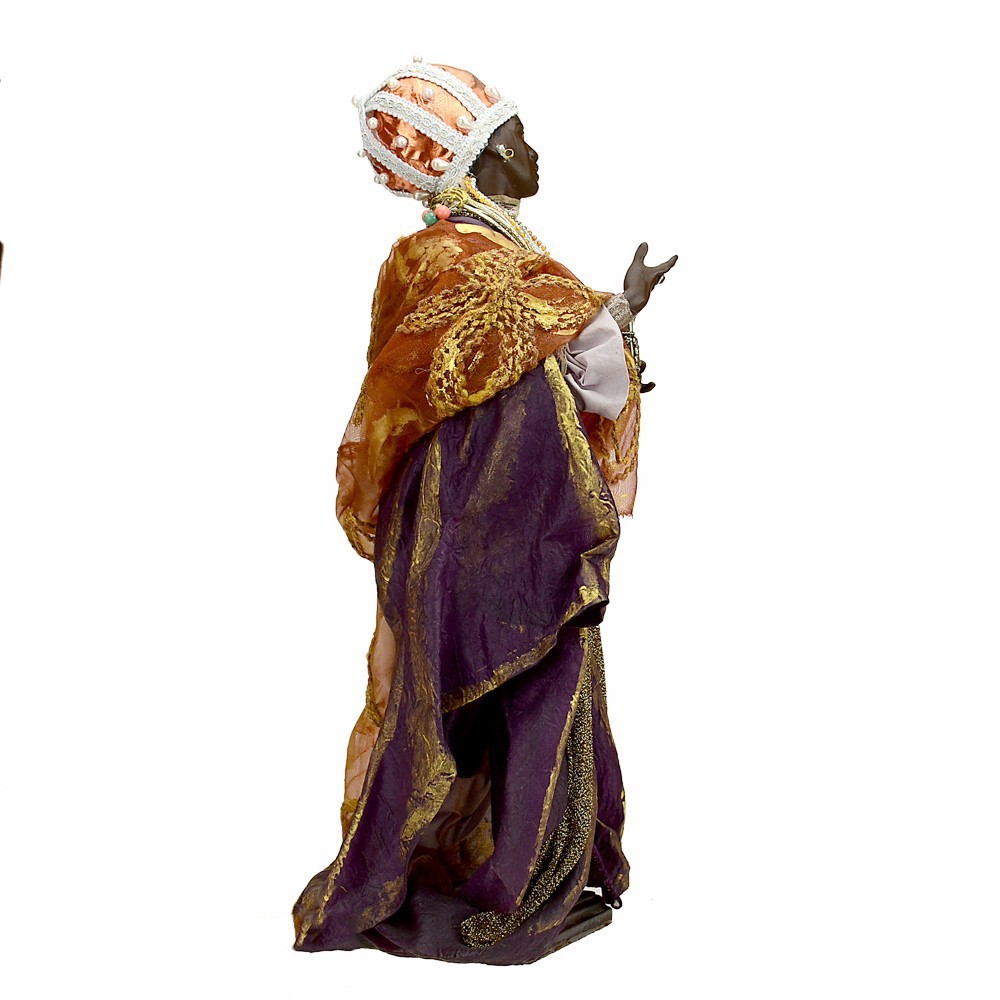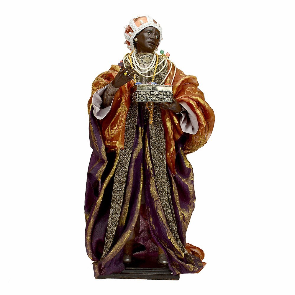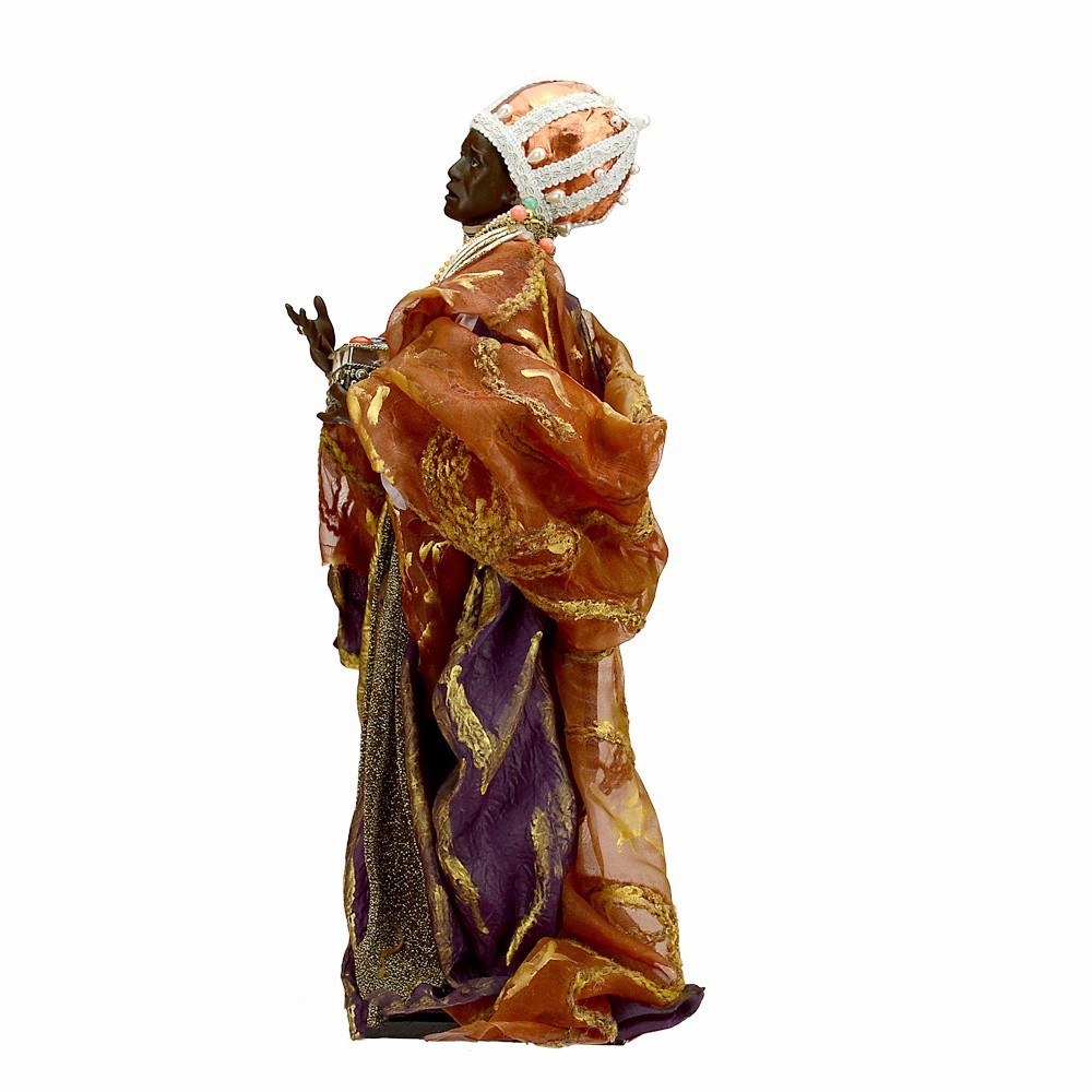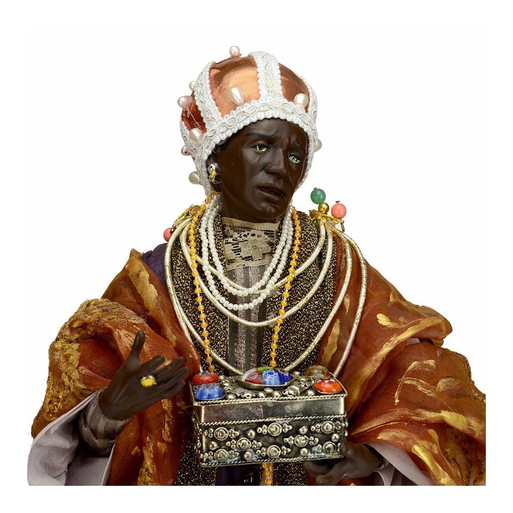 Re Magio moro per presepe napoletano da 45 cm. Una figura realizzata con maestria da artigiani napoletani che custodiscono l’antica tradizione del presepe in terracotta. Ogni statua nasce dalla lavorazione manuale dell’argilla, poi dipinta e vestita con autentici abiti in tessuto. Un’opera che unisce arte, fede e cultura popolare, ideale per arricchire le rappresentazioni artigianali del presepe napoletano tradizionale