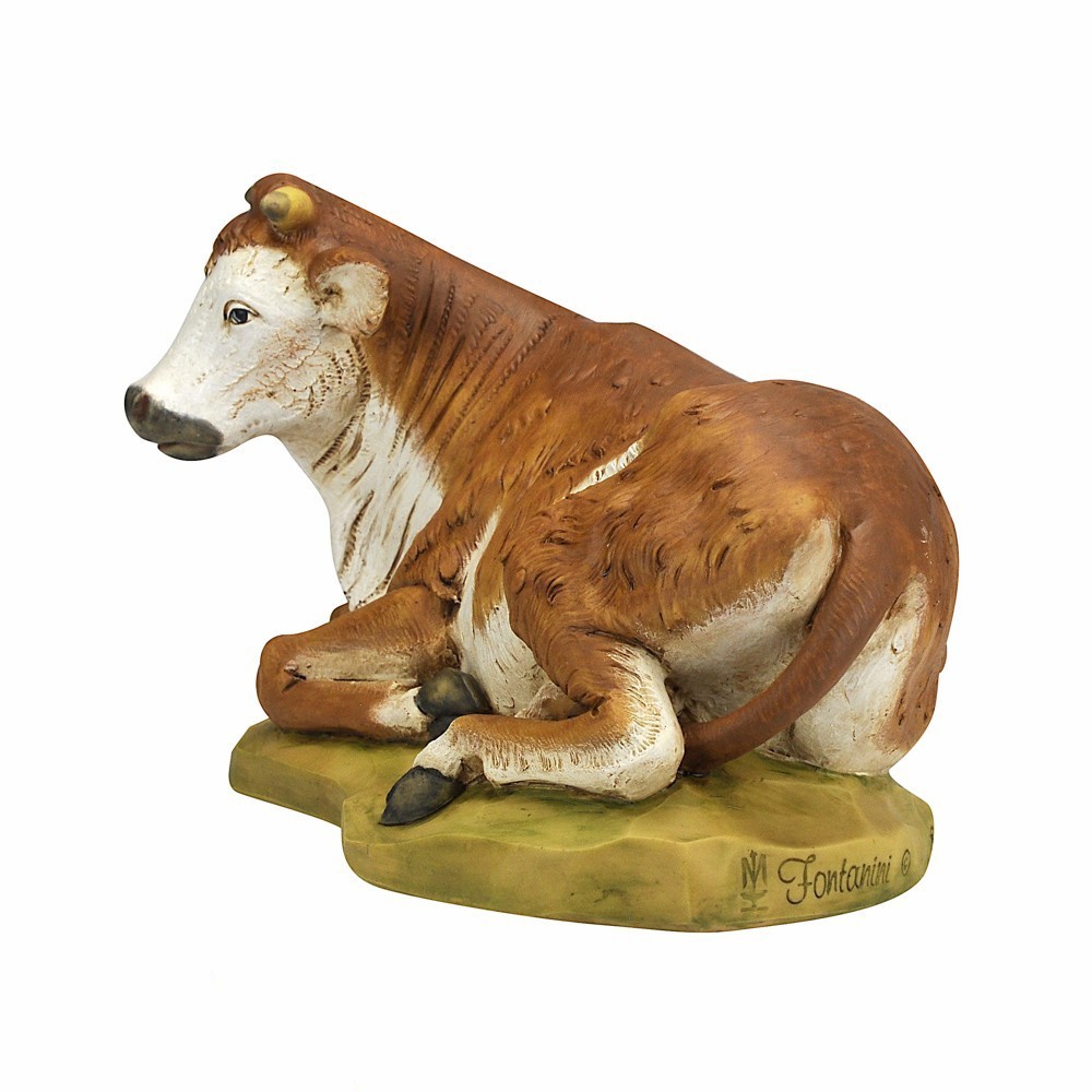Bue Seduto di colore marrone per la Natività del Presepe Fontanini. Proporzionato x statue di 52 cm. Realizzato in Italia e dipinto interamente a mano, dall'azienda Fontanini.