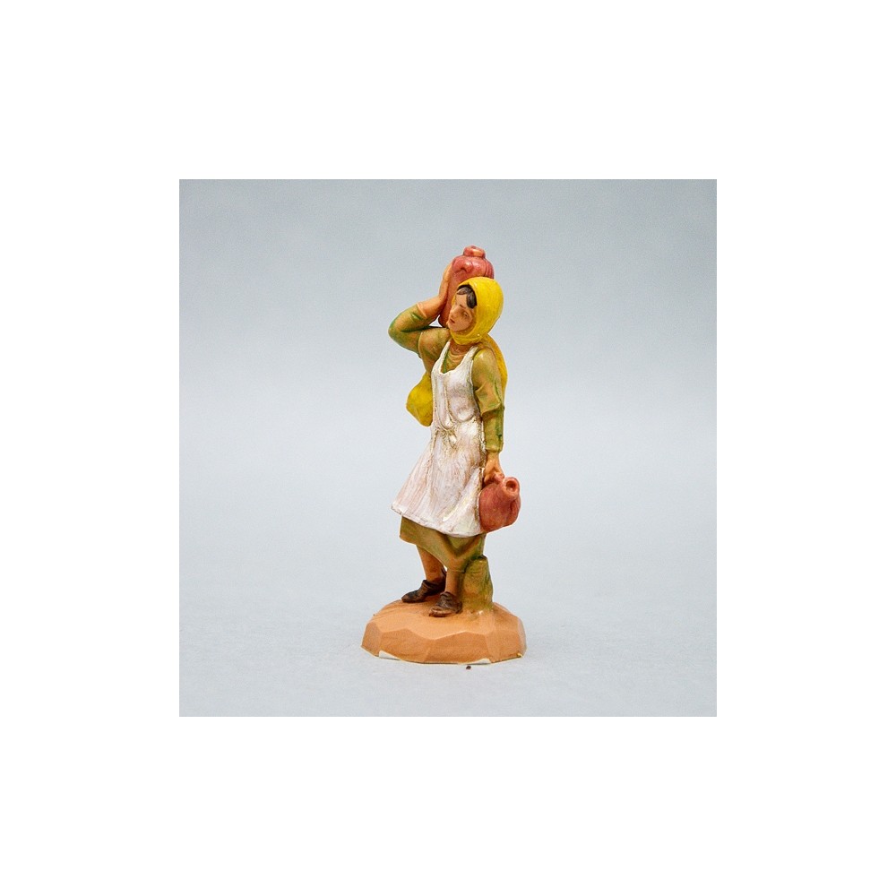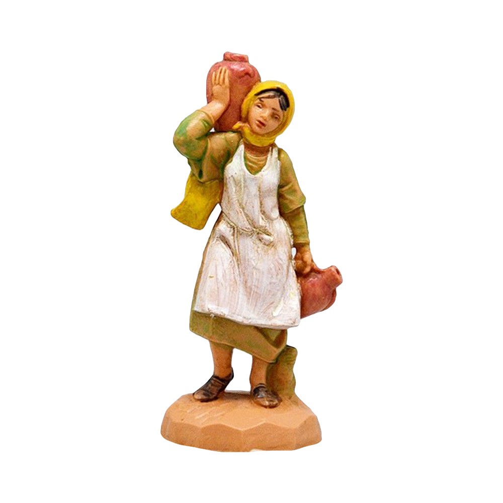 Pastorella con Anfore e Giare per Presepe Fontanini da 6,5 cm. Realizzato in PVC, dipinto interamente a mano. Colorazione: Tipo legno. Made in Italy.