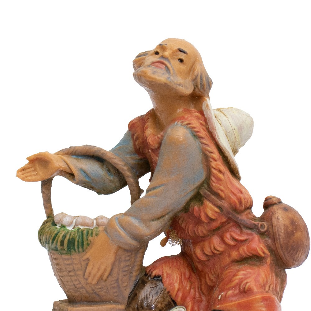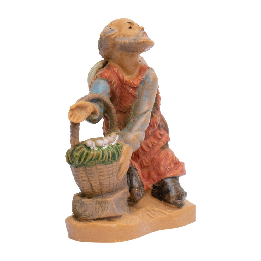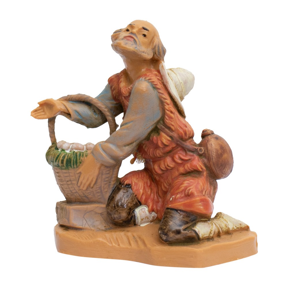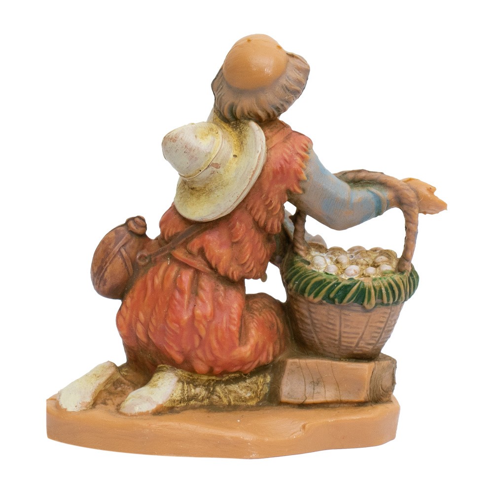 Personaggio Pastore in ginocchio con uova nel Cesto e Cappello per il Presepe Fontanini da 6,5 cm.