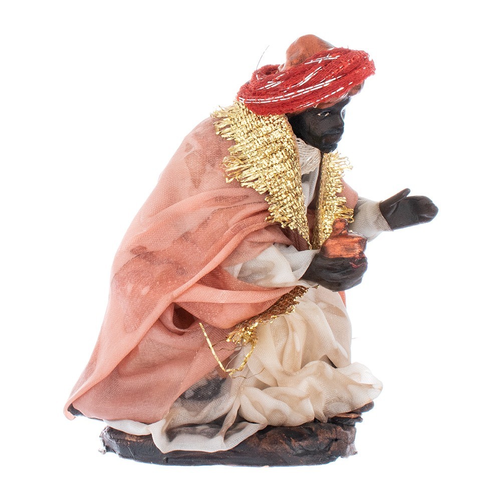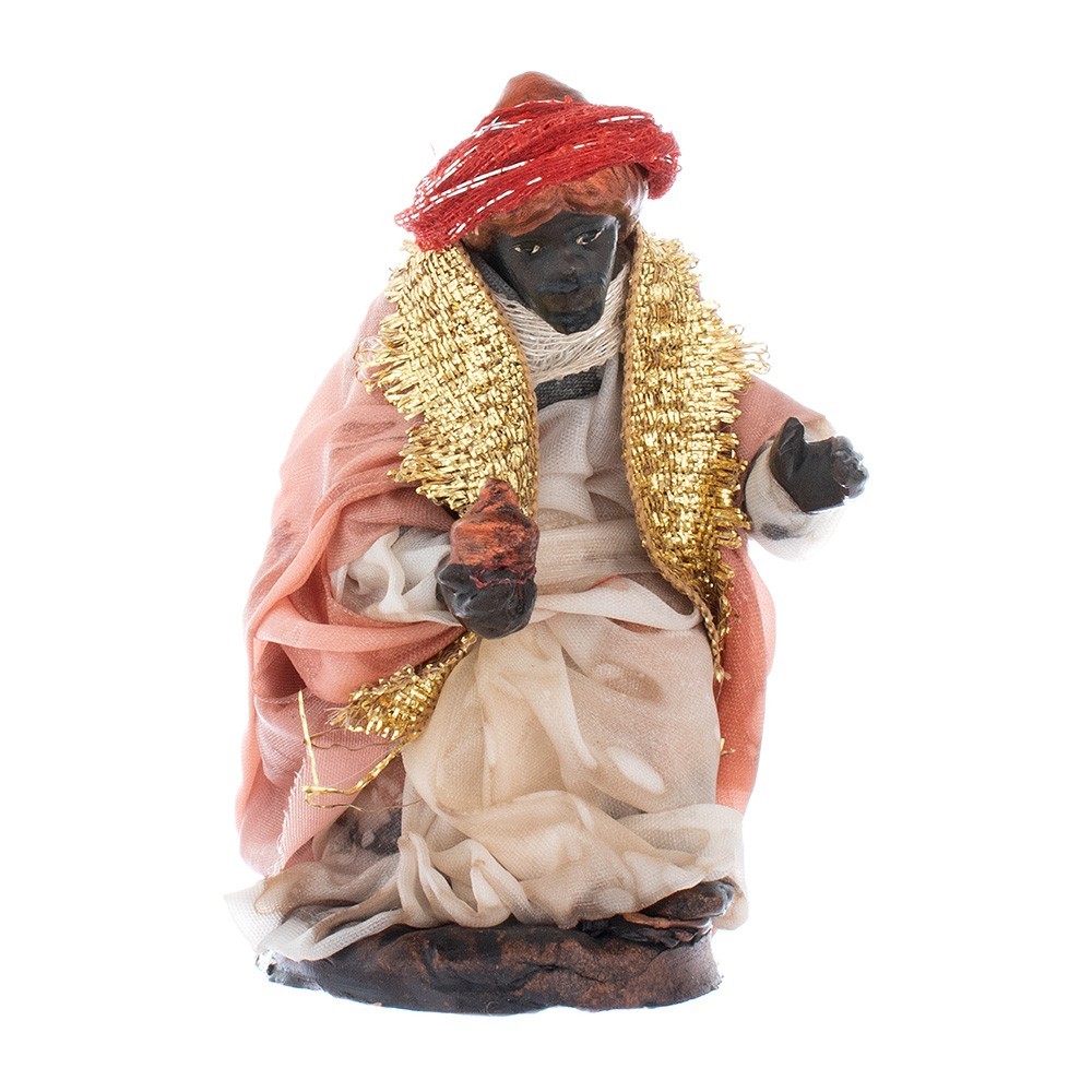 Statua Re Magio Moro cm 8 in terracotta. Questa statua è realizzata in terracotta e interamente fatta e dipinta a mano. Gli abiti sono in stoffa. La statua è adatta per presepe napoletano da 8 cm.