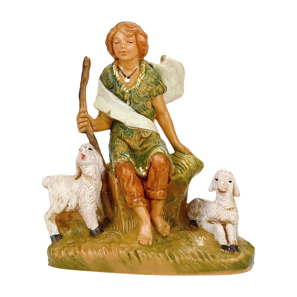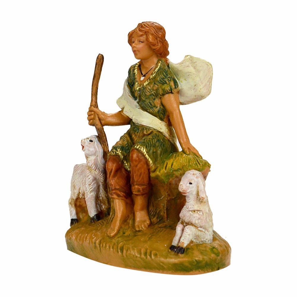 Pastorello seduto con due pecore vicino. La Statuetta è proporzionata per presepe Fontanini da 9,5 cm. Realizzata in PVC e dipinta interamente a mano.
