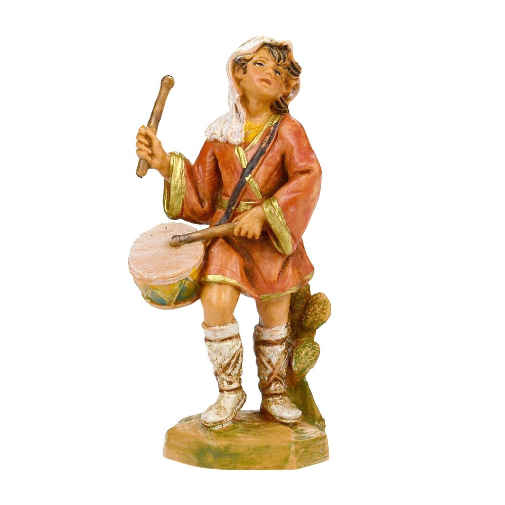 Statua pastorello Fontanini che suona il tamburo. La statua è adatta per presepe da 9,5 cm. Realizzato in PVC materiale infrangile e dipinta finemente a mano.