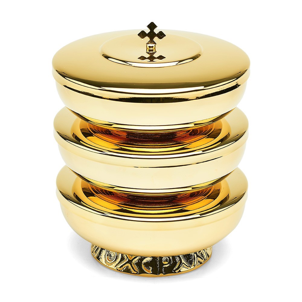 Pisside a tre piani in ottone dorato. Completa di coperchio con croce. Può contenere circa 600 particole.
