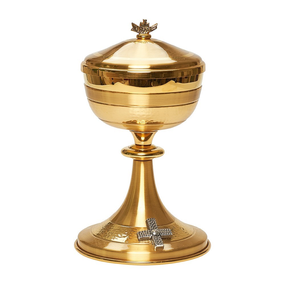 Pisside eucaristica in ottone dorato satinato con coppa lucida. La pisside è realizzata con lavorazione martellata, completa di croce applicata sulla base. Può contenere circa 90 particole.