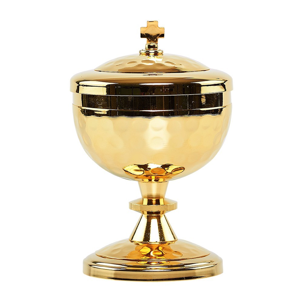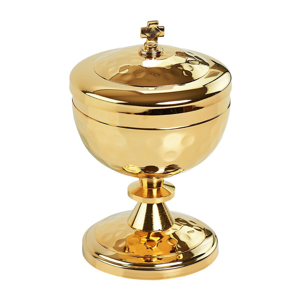 Mini pisside decorata per ostie realizzata in ottone dorato. Contiene circa 70 particole.
