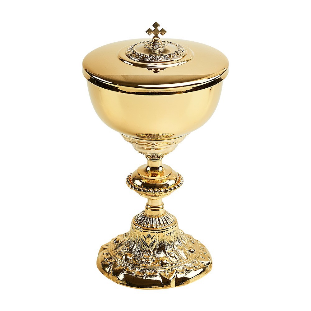 Questa pisside liturgica è in stile barocco, finemente lavorata. La pisside è alta 26 cm e il diametro della coppa è 14 cm.