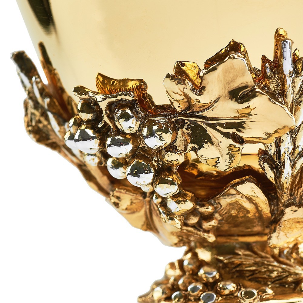Pisside in ottone dorato, con decori in peltro raffiguranti vite e uva. Completa di coperchio con croce.