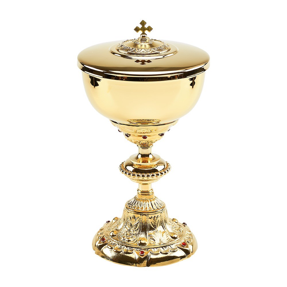 Pisside liturgica in stile barocco, finemente decorata e arricchita con inserti rubino.