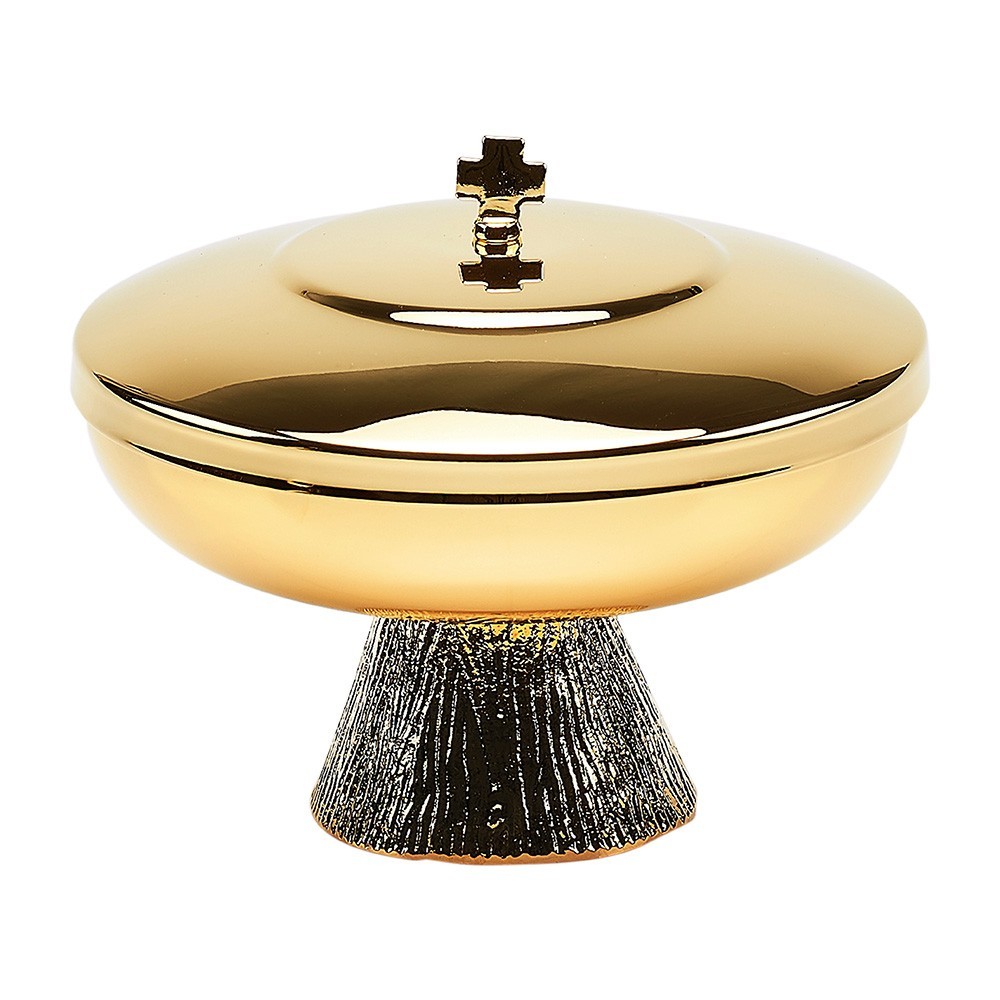 Pisside offertoriale in ottone con finitura oro. La base della pisside si presenta con righe verticale.