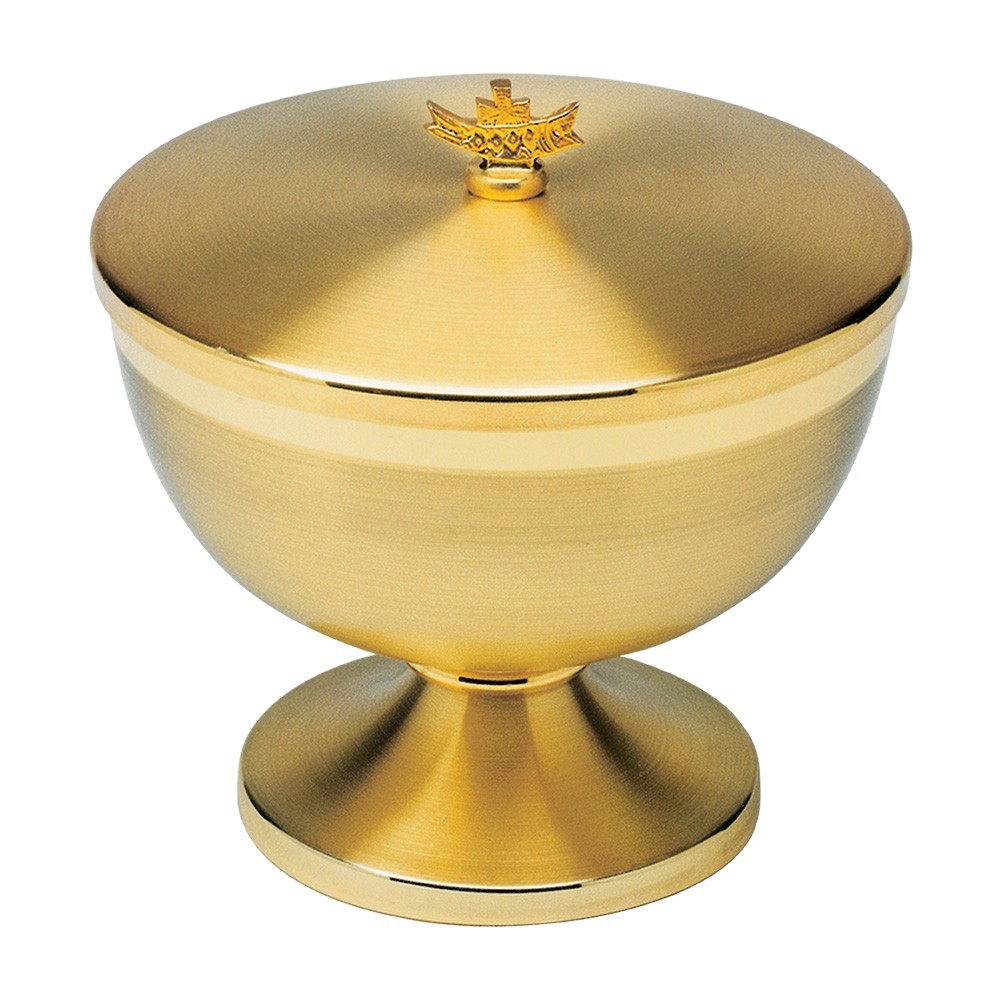 Pisside chiesa interamente in ottone dorata e satinata. La decorazione raffigura un pesce e una croce lavorati in fusione a cera persa.