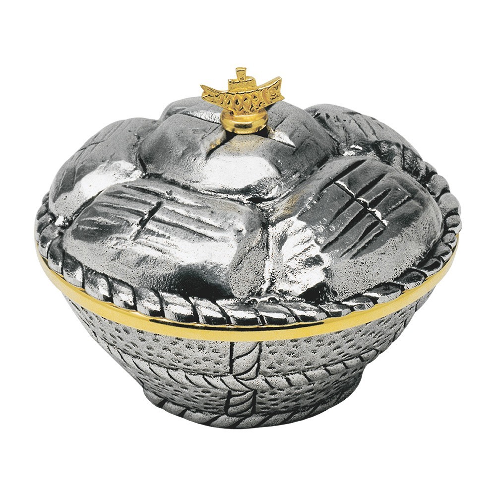 Pisside liturgica alta 10 cm, realizzata in ottone con fusione argentata e coppa dorata. La forma di questa pisside è di cesto di pane.