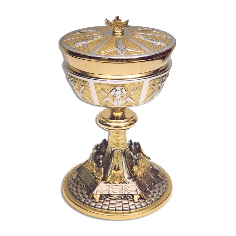 Pisside in ottone bicolore per la celebrazione liturgica. Questa bisside è cesellata e decorata con riporti in fusione a cera persa. Sulla base è raffigurata l'Ultima Cena e sul sottocoppa sono raffiguarti dei gigli sbalzati. La pisside è alta 26 cm e il diametro della coppa è 13,5 cm.