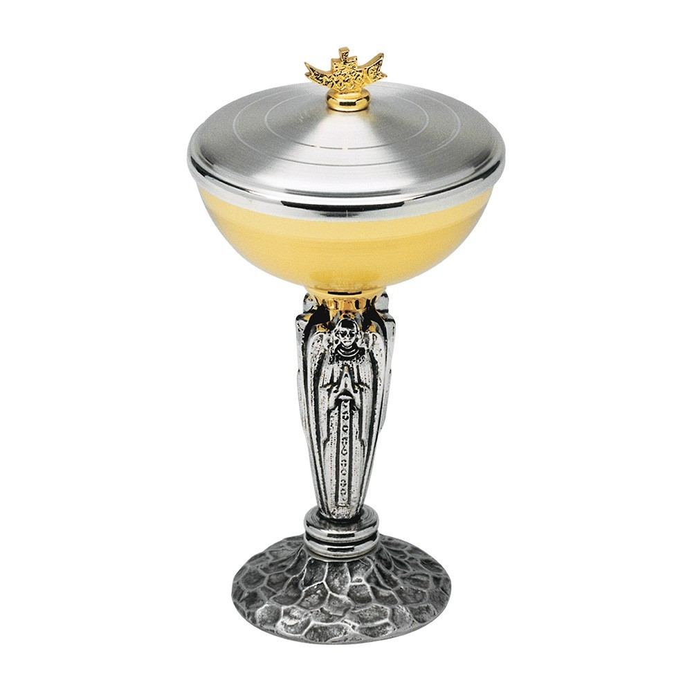 Pisside in ottone con finitura oro e argento, con decori in fusione argentati sulla base e sulla colonna che raffigurano angeli. Prodotto interamente realizzato a mano da artigiani professionisti, garantendo materaili e lavorazione di prima scelta.