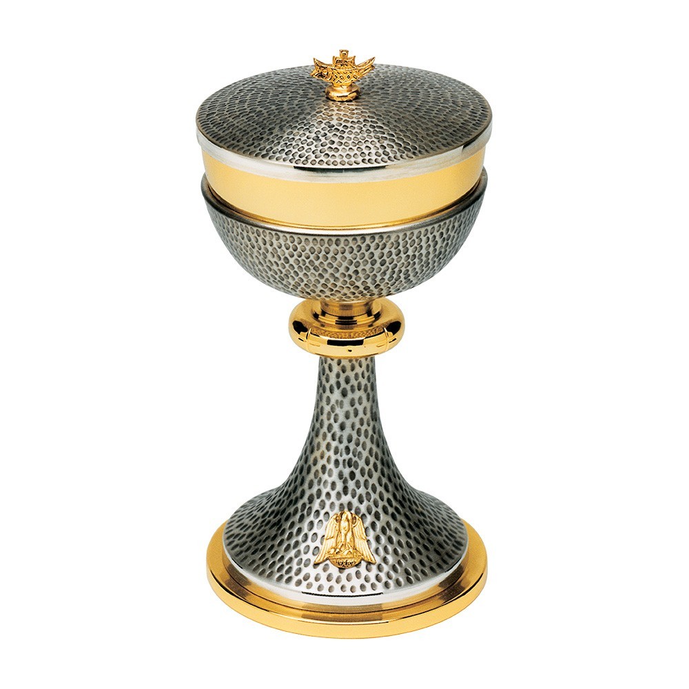 Pisside liturgica in ottone lavorato mediante la tecnica della martellatura. La base è impreziosita e arricchita da un simbolo raffigurante un pellicano dorato, realizzato in fusione a cera persa.