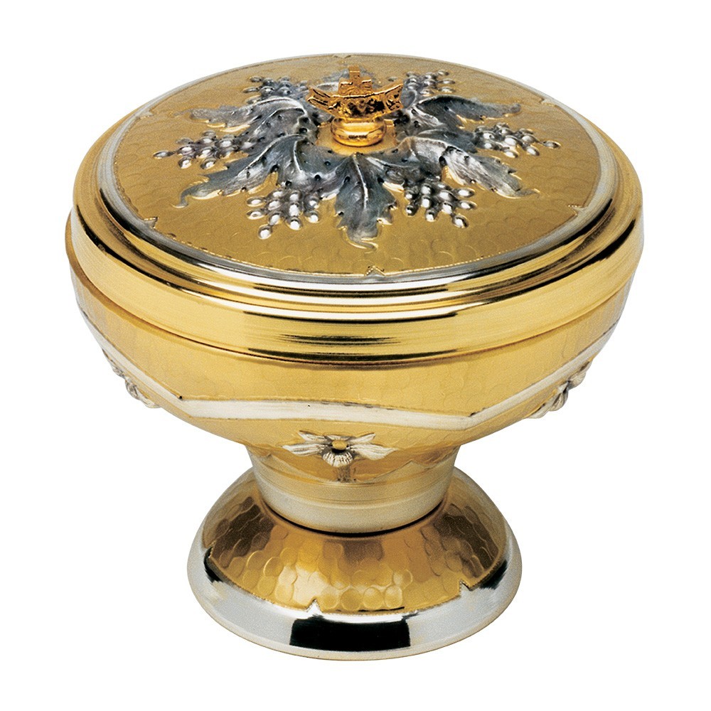 Pisside per comunione sotto le due specie in ottone dorato. Il coperchio è finemente decorato con grappoli d'uva argentati.