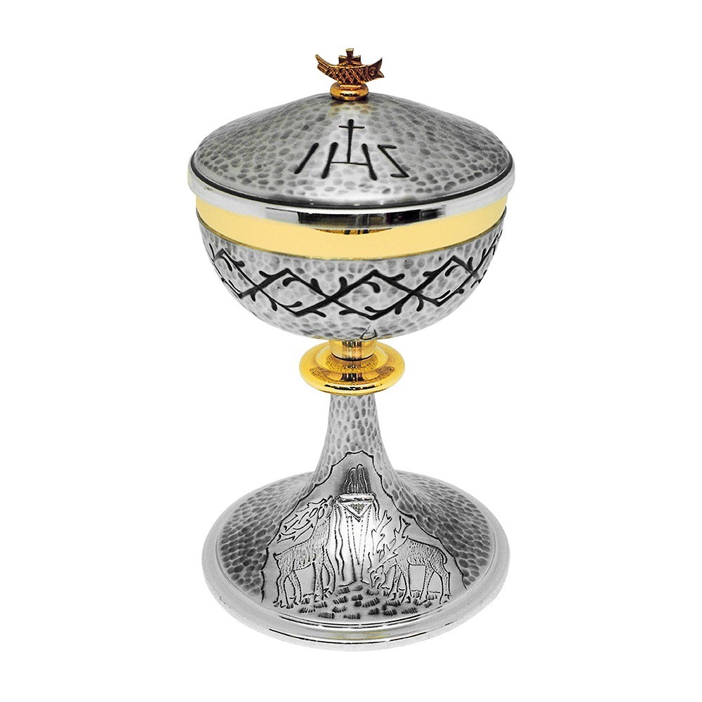 Pisside eucaristica in ottone con finitura argentata e cesellata. La base è decorata con cervi alla fonte e il sottocoppa è disegnato con corona di spine.