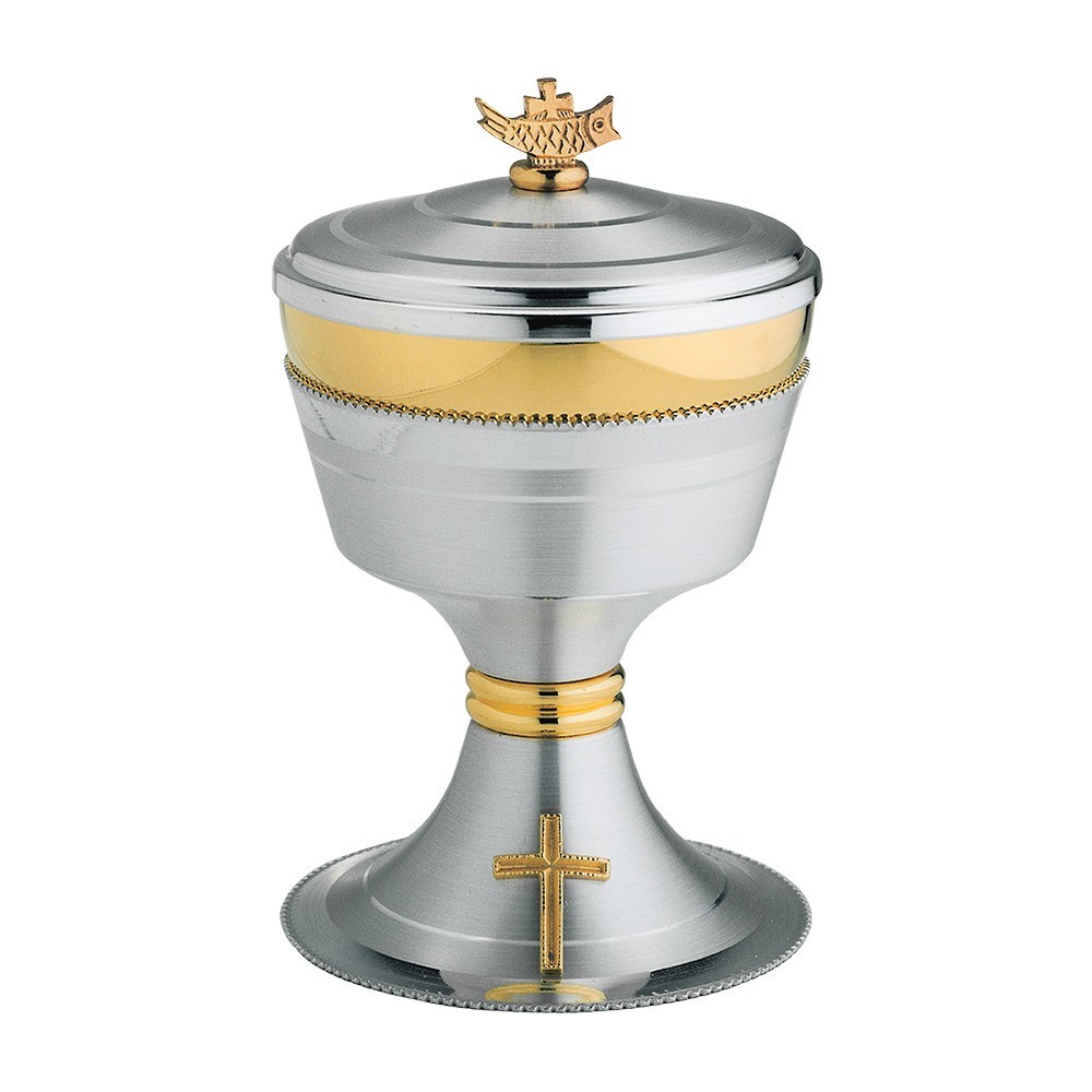 Questa pisside eucaristica è in ottone argentata e satinata. Sulla base è applicata una croce dorata, mentre il bordo del piede e del sottocoppa sono godronati.