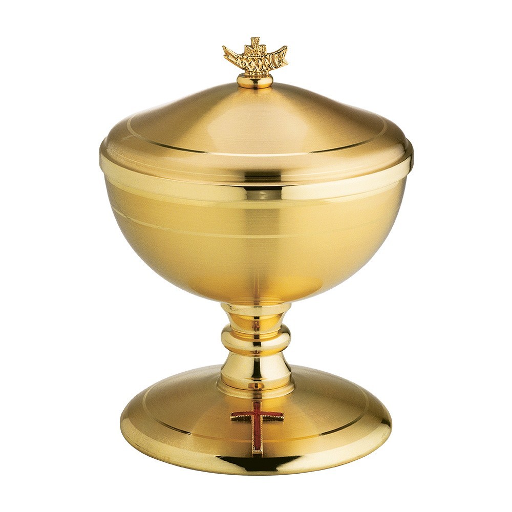 Questa pisside per le celebrazioni eucaristiche è in stile moderno. Realizzata in ottone dorato e satinato. Sulla base è posta una bellissima croce smaltata in rosso e profili dorati lucidi ornano l'intera pisside.