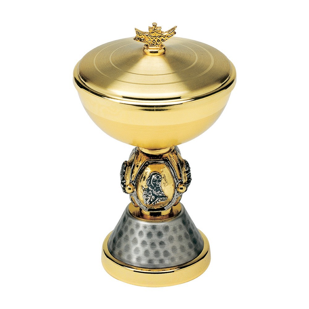 Pisside liturgica in ottone con base decorata con finitura argento anticato.