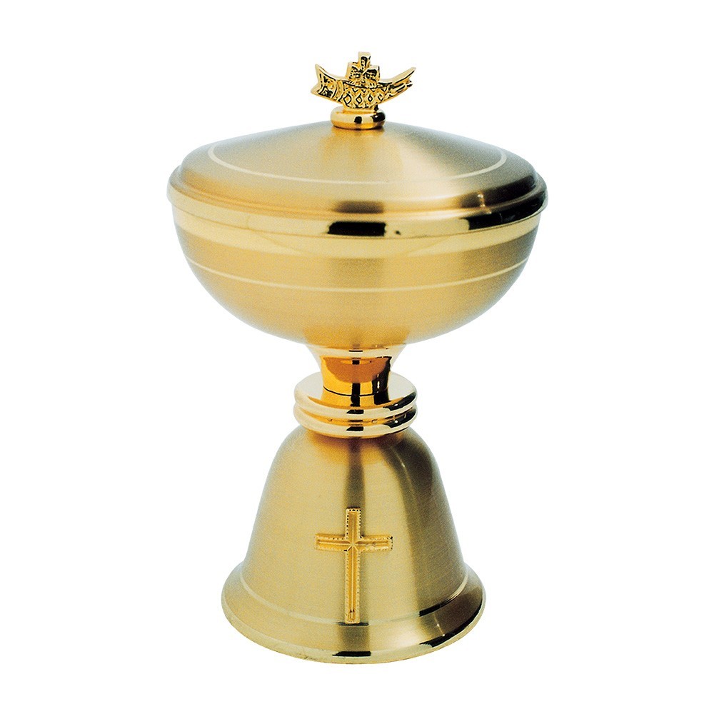 Questa pisside da messa per le celebrazioni eucaristiche è in ottone dorata e satinata. Sulla base vi è riportata una croce dorata, mentre i profili sono lucidi.