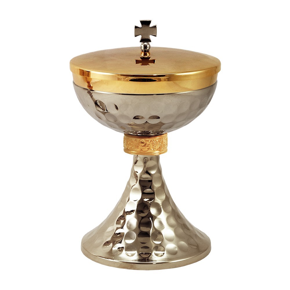 Pisside liturgica con base e sottocoppa martellati. Particoare è il nodo che raffigura "Uva e foglie di vite". L'altezza della pisside è 16 cm.