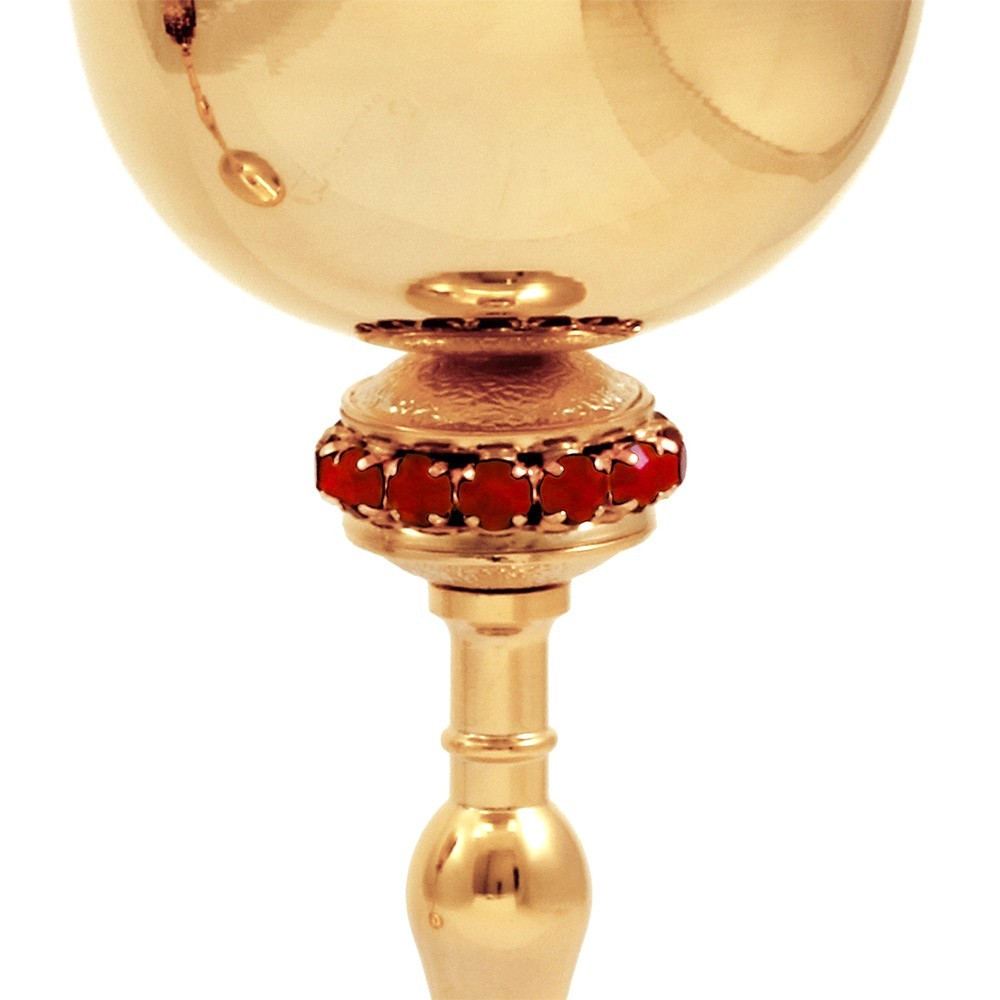 Pisside per particole realizzato in ottone dorato con doratura garantita 24k. La particolarità di questa arredo liturgico è il nodo decorato con pietre rosse incastonate.