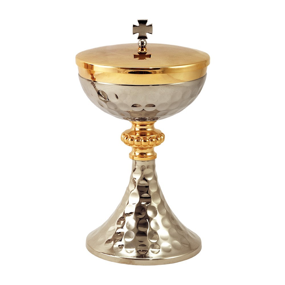 Pisside sacra in ottone con finitura bicolore oro e argento. Realizzato con base e sottocoppa martellata. Molto particolare è il nodo con effetto perline realizzato con la tecnica in fusione.