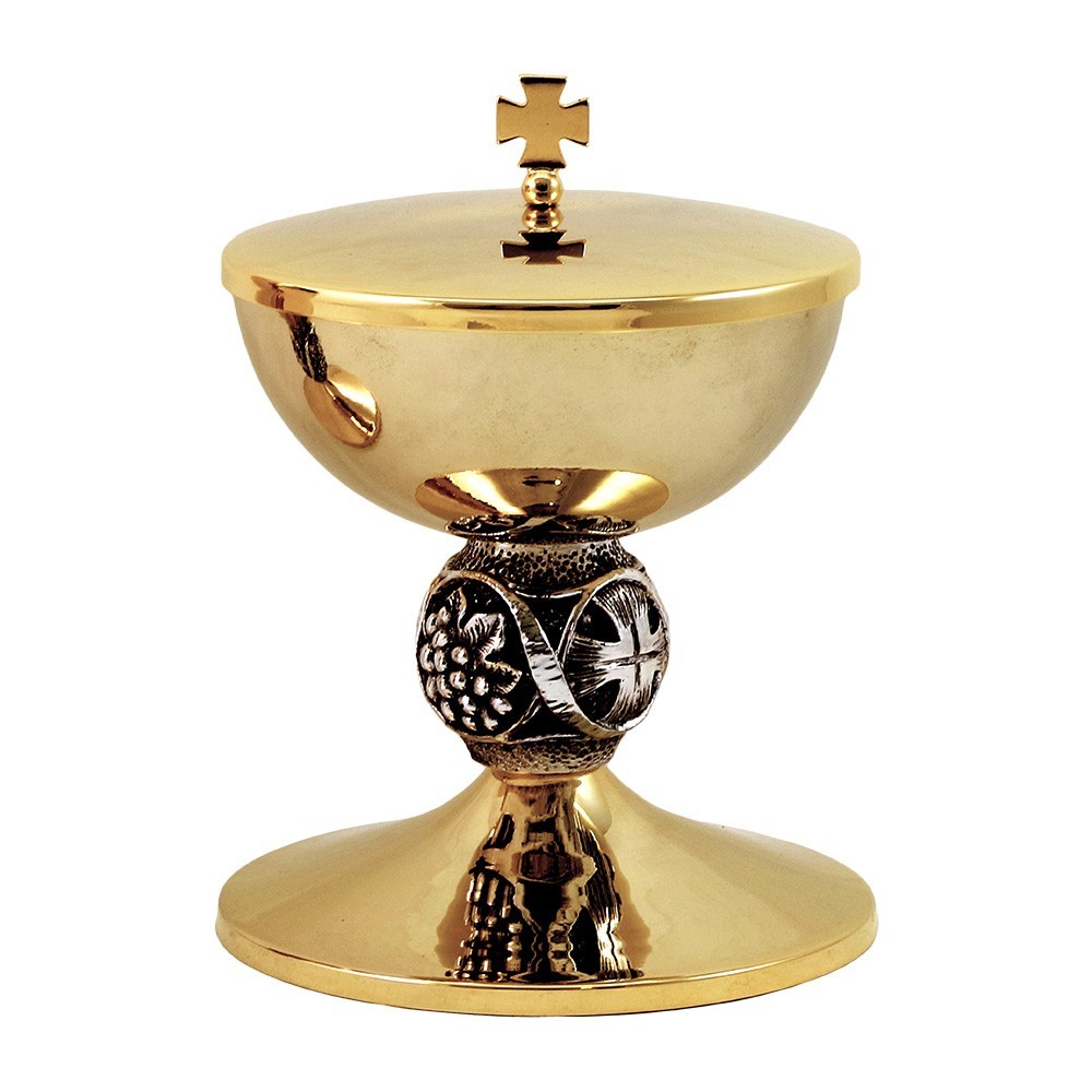 La pisside è in ottone dorato, il nodo rappresenta croce e grappoli d'uva, ed è realizzato con la tecnica in fusione. La finitura del nodo è in argento antico con vernice protettiva.