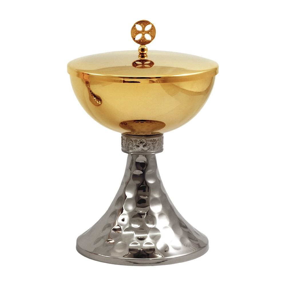 Pisside per la santa messa realizzata in ottone con finitura oro e argento. Questa pisside liturgica si presenta con base martellata, con nodo in fusione decorato "Uva e foglie di vite".