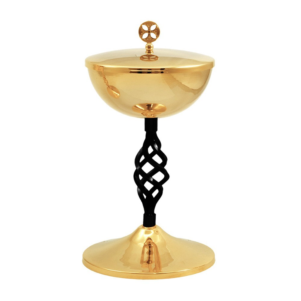Pisside liturgica realizzata con base e coppa in ottone lucido con doratura 24 carati. Molto particolare è il nodo dalla forma elittica con finitura ossidata.