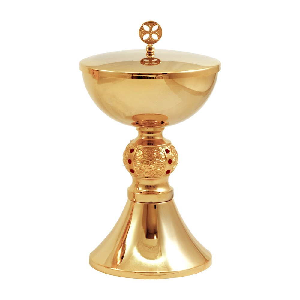 Pisside liturgica per particole in ottone dorato. Si presenta con nodo in fusione impreziosito con pietre rosse.