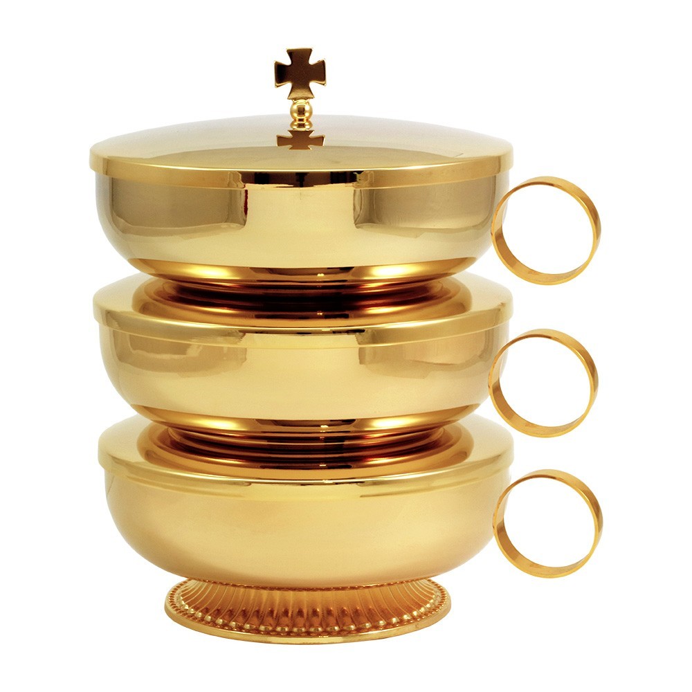 Pisside a tre piani con tre anelli per manico. Questa pisside per concelebrazione è interamente in ottone dorato con doratura 24k, con base finemente lavorata. Può contenere circa 300 particole.